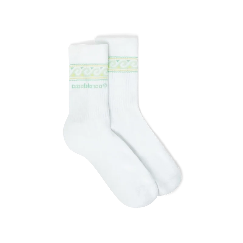 Les chaussettes de sport Knitted Wave présentent un design athlétique raffiné avec une bordure ondulée dans des tons verts et jaunes, s’inspirant des motifs rythmiques des vagues de l’océan venant s’échouer sur des plages immaculées. Ce design incarne l’esthétique Beach Club de la maison à travers des motifs ondulés sophistiqués rendus sur une construction en tricot haut de gamme. Elles sont dotées de bords-côtes et d’une construction renforcée au talon et à la pointe.