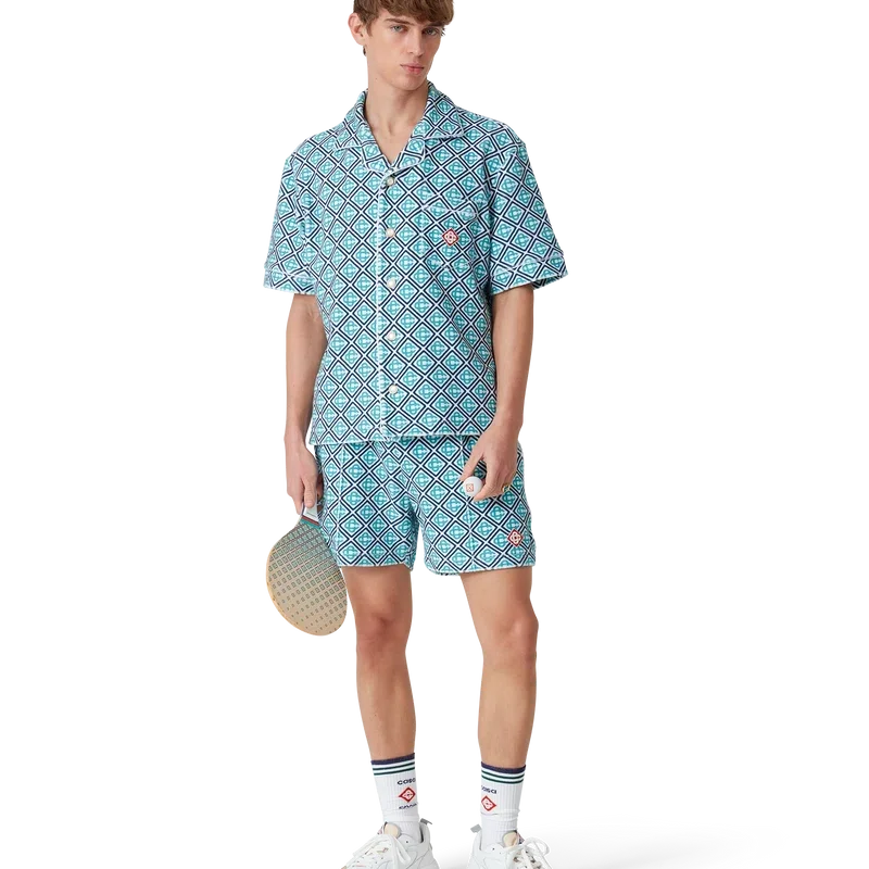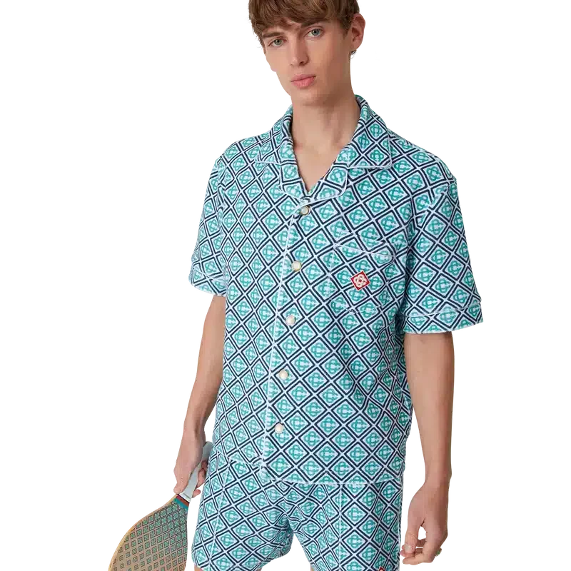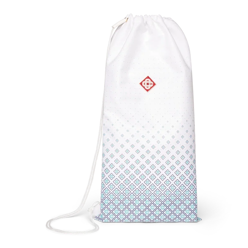 Les raquettes et balles de plage sont fabriquées en contreplaqué et peintes à l’huile, et arborent l’imprimé monogramme dégradé de la maison sur leurs faces. Elles sont agrémentées de rayures peintes en vert menthe, orange et bleu marine sur la gorge, d’une poignée blanche et de deux balles en caoutchouc griffées. Elles mesurent 19,2 cm (de face à face) x 39 cm (du bord supérieur de la face au bas de la poignée) et sont livrées avec leur propre sac de rangement griffé muni d’une sangle.