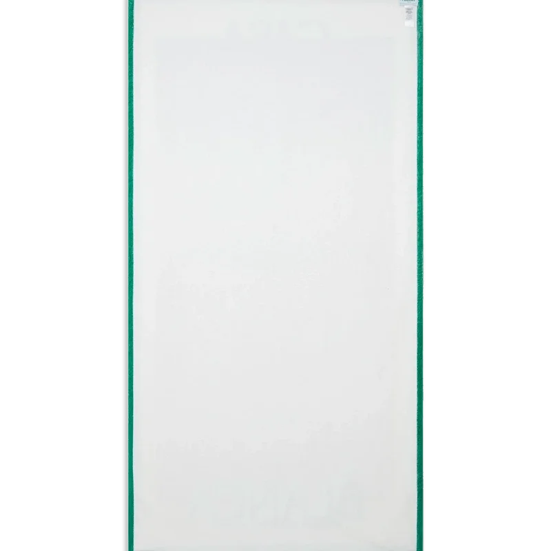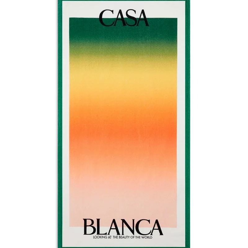 La serviette de plage dégradée est confectionnée en coton biologique et arbore le logo superposé de la maison sur un fond imprimé dégradé de la saison, symbolisant les riches échanges entre les disciplines culturelles dans l’art, la musique et le cinéma africains. Elle est rehaussée d’un cadre blanc et de bords verts.