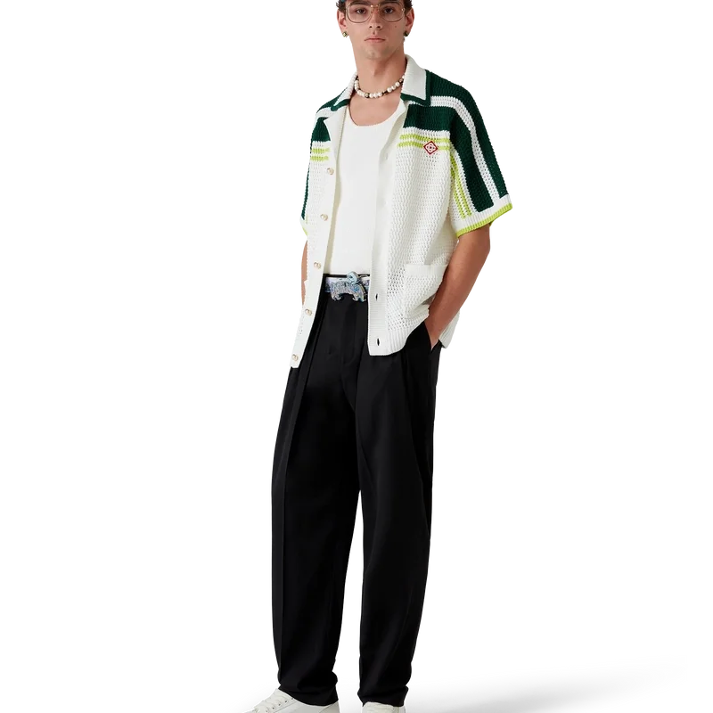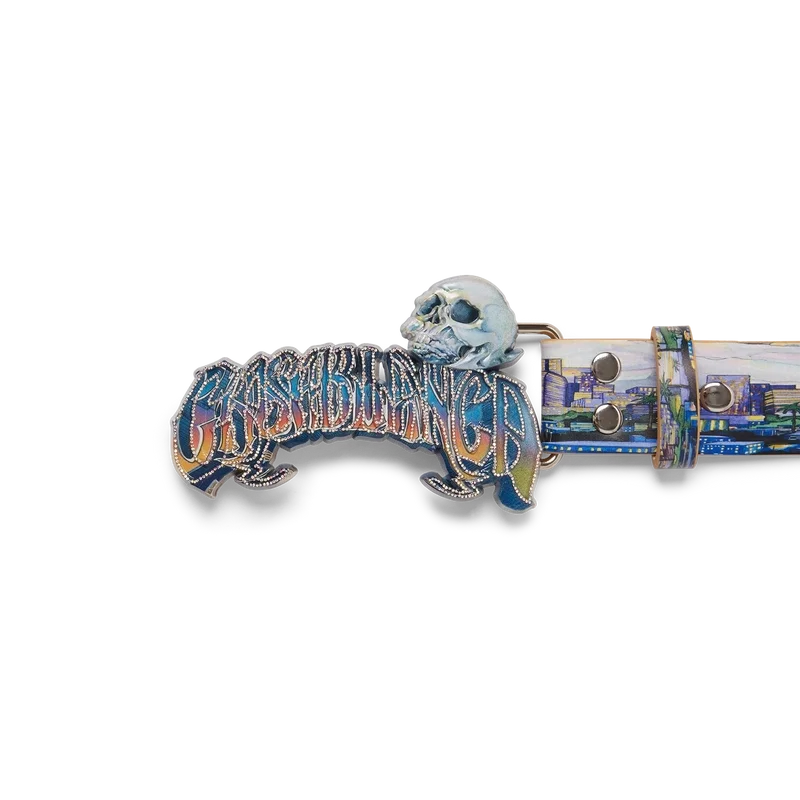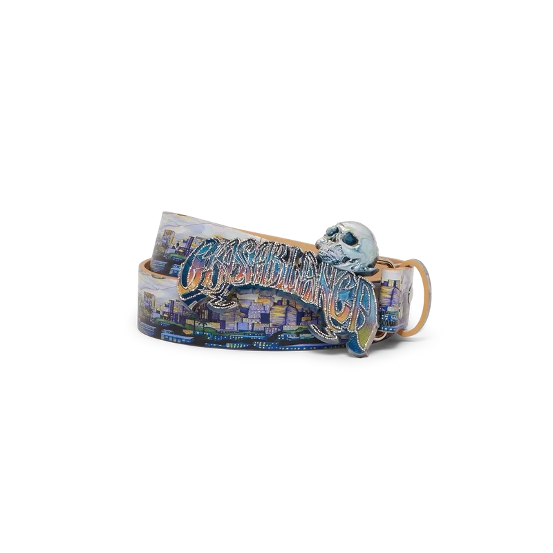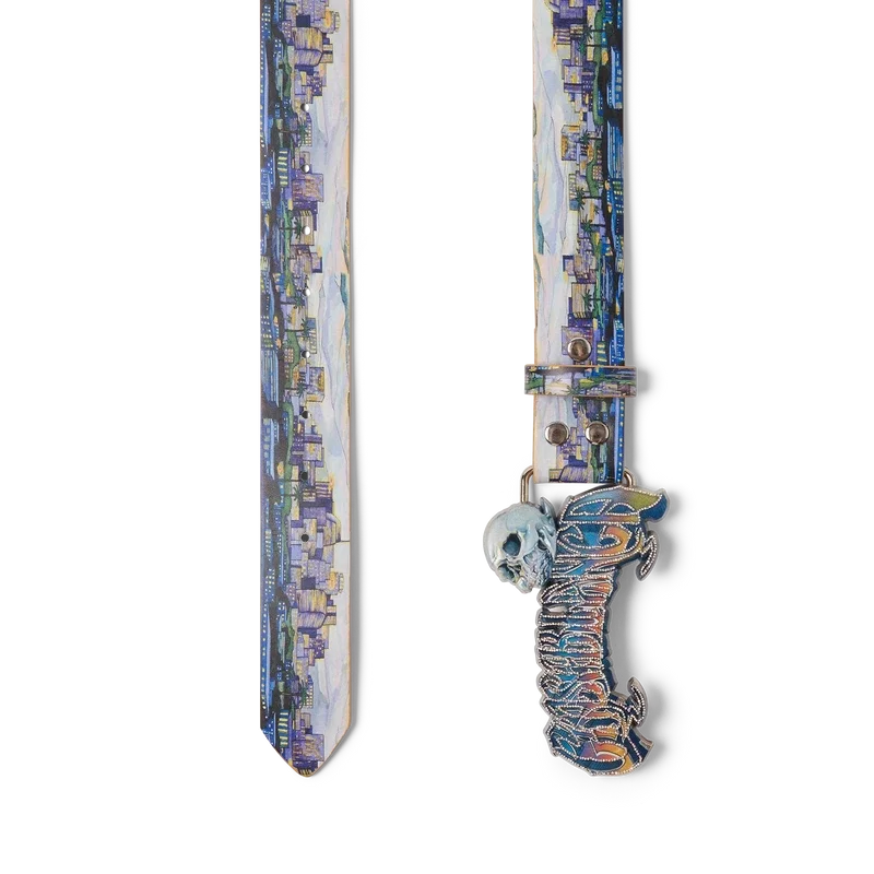 La ceinture La Premonition présente un motif saisonnier de la Maison inspiré d’une vision inquiétante de la ligne d’horizon de La de nuit, avec des éléments OVNI évoquant la science-fiction vintage, et est confectionnée en cuir de veau. Elle est dotée d’une boucle en laiton peint arborant le logo Casablanca en typographie dessinée à la main, inspirée de la police gothique utilisée dans les tatouages, dans le dégradé de la saison, ainsi qu’un crâne.