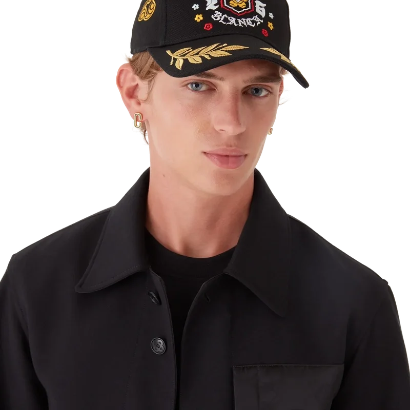 La casquette brodée d’un laurier BōSōZoku est un modèle de baseball classique confectionné en twill de coton et orné du motif de cette saison, pour lequel nous nous sommes inspirés de la sous-culture japonaise BōSōZoku, l’un de nos thèmes principaux. Le contraste entre les éléments graphiques et le texte nous a semblé très « Casablanca ». La mise en page est non conventionnelle, mais la composition est soigneusement équilibrée, ce qui lui confère un aspect à la fois unique et harmonieux. La casquette est agrémentée d’une visière ornée d’une feuille de laurier dorée et d’une boucle réglable plaquée or.
