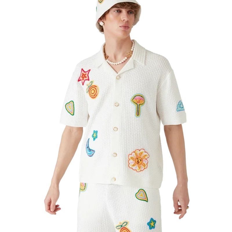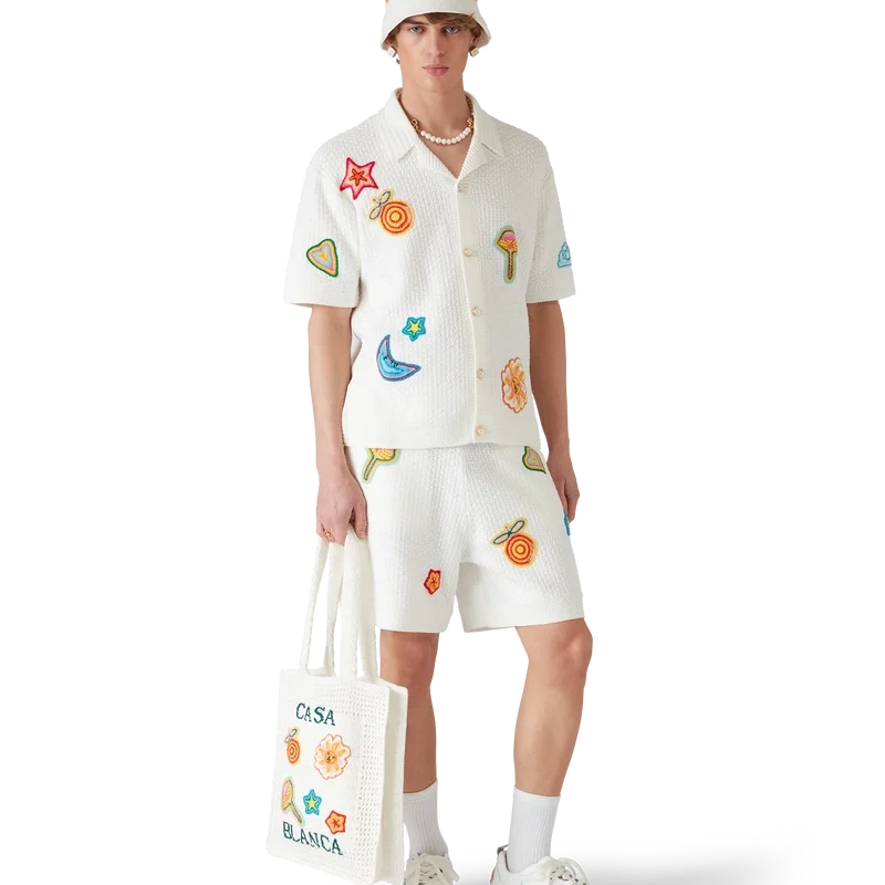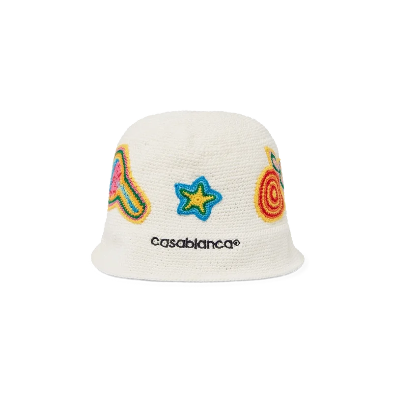 Le bonnet au crochet Motif est un modèle de type bob, confectionné dans un tissu en coton au crochet à mailles ouvertes et à la texture douce : l’indispensable de l’été. Il est doté d’un bord, d’un logo Casablanca brodé et d’appliqués reprenant les éléments de design classiques de la maison en son centre.