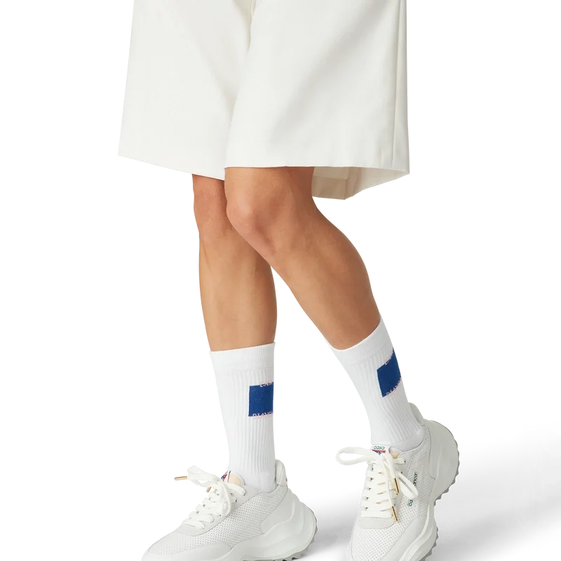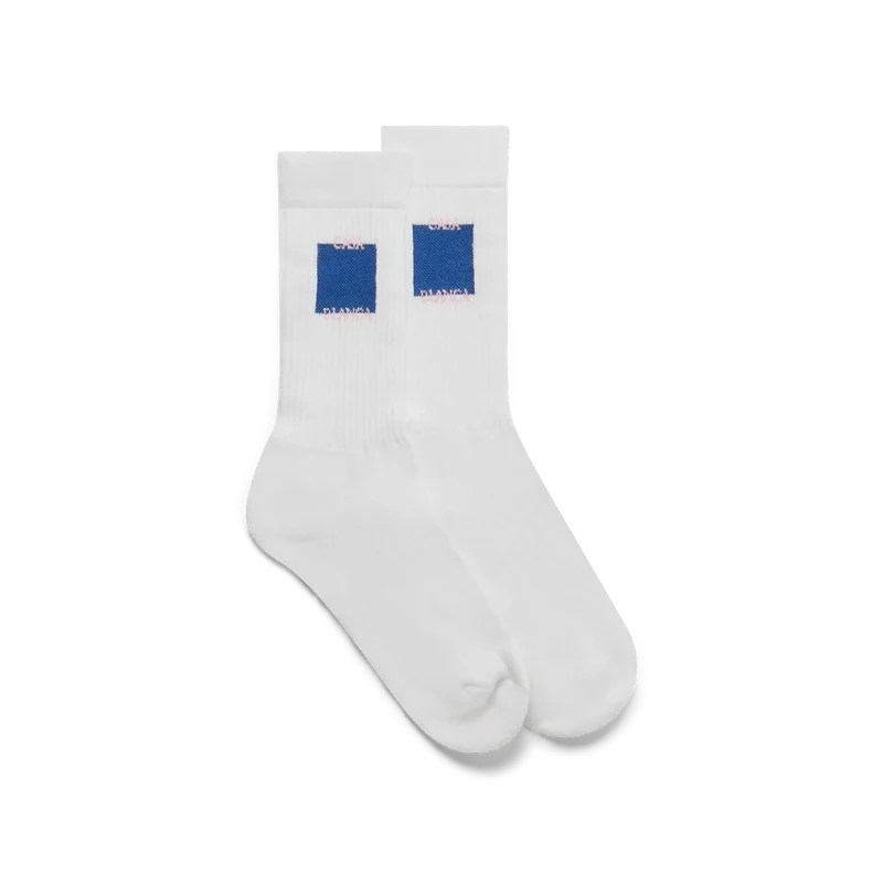 Les chaussettes carrées Casa bleues sont confectionnées dans un tissu en coton mélangé et arborent le logo superposé de la maison avec un motif carré bleu. Finition à bords-côtes.