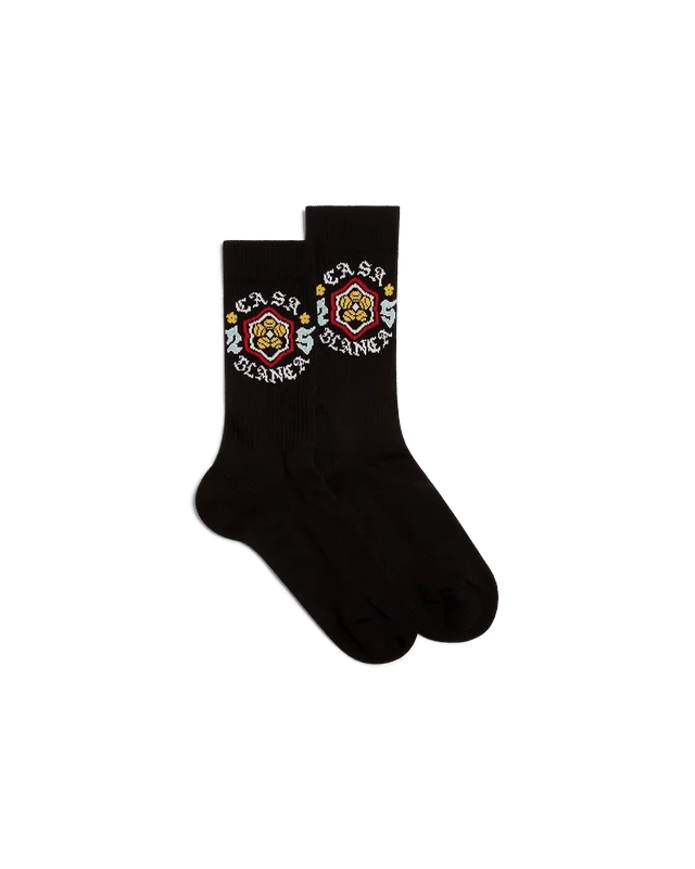 Les chaussettes Emblem présentent un design sportif. Elles sont confectionnées dans un tissu en coton mélangé et arborent un motif saisonnier avec le logo Casablanca. Nous nous sommes inspirés de la sous-culture japonaise pour l’un de nos thèmes principaux. Elles sont dotées de bords-côtes aux chevilles et aux poignets.