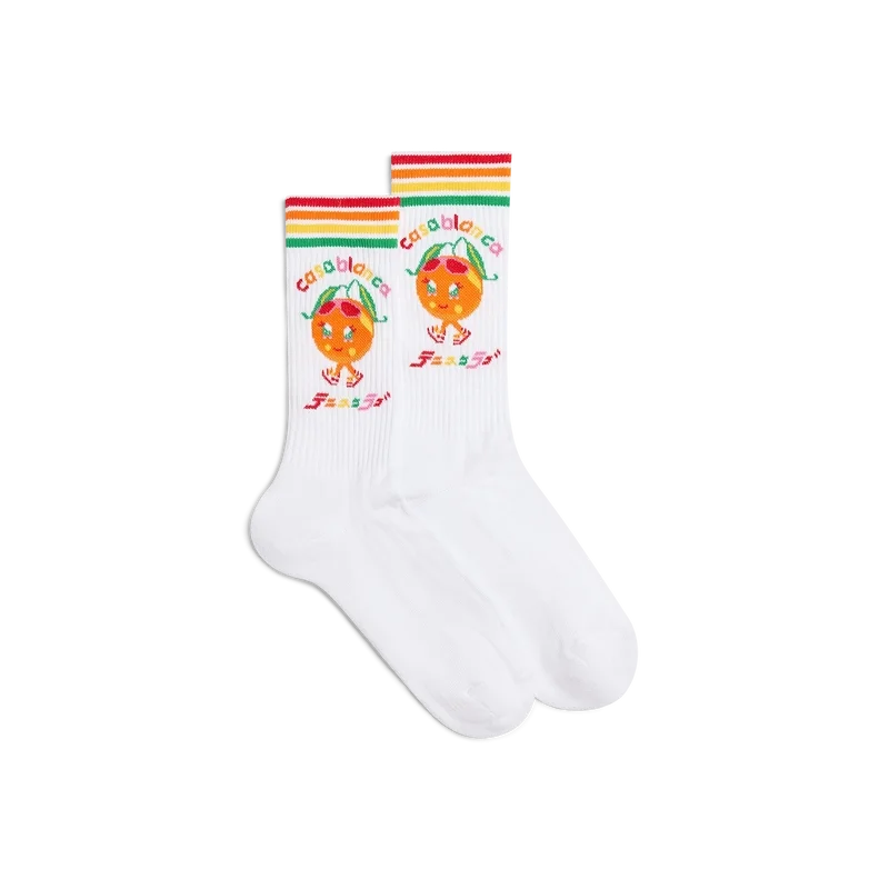 Les chaussettes Kawaii Orange sont des chaussettes de sport blanches, confectionnées dans un tissu en mélange de coton, et arborent le motif de la saison représentant ce personnage, conçu sous la forme d’une orange, autre figure clé de notre univers, avec des Accessoires Casa, des lunettes et des baskets. Elles sont dotées de bords-côtes aux chevilles et de détails rayés verts, jaunes, orange, rouges et blancs sur les poignets.