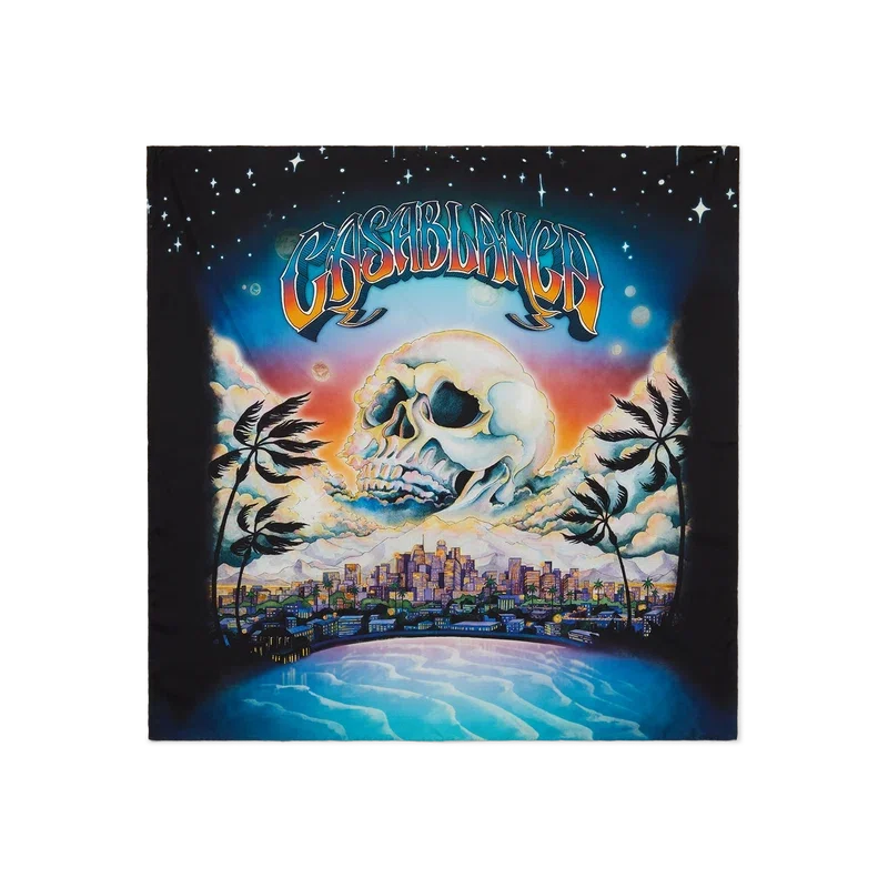 Le grand foulard en soie La Pramonition est un modèle imprimé confectionné en twill de soie, arborant le motif saisonnier de la maison : une vision inquiétante de la ligne d’horizon de La de nuit, avec des éléments OVNI s’inspirant de la science-fiction vintage. Rehaussé d’une bordure noire.