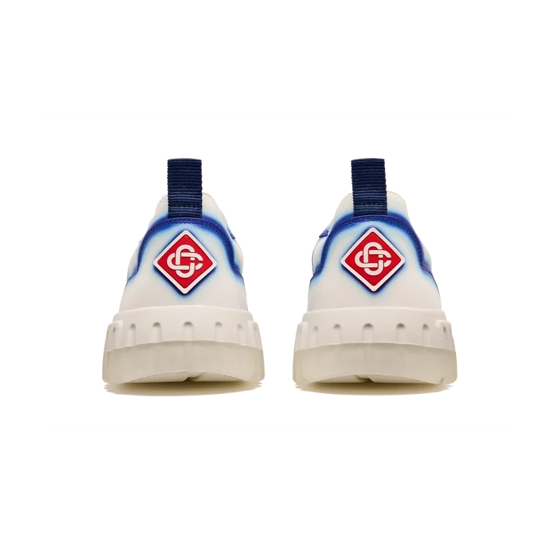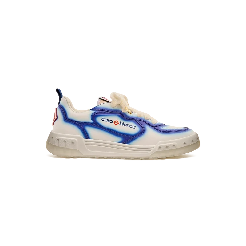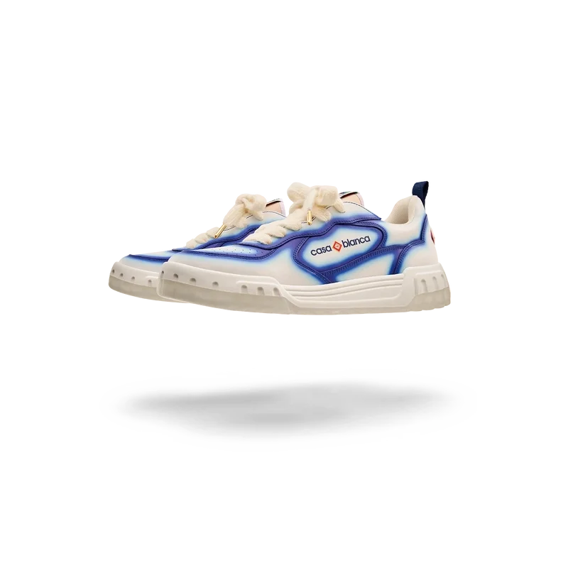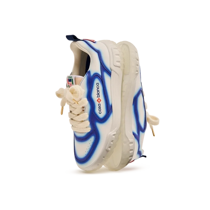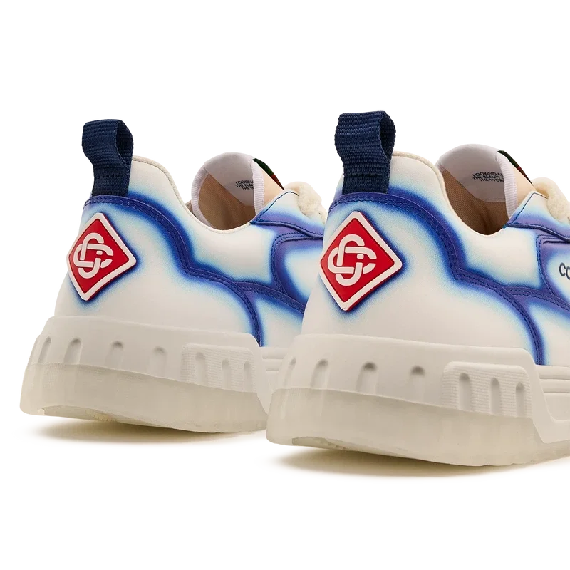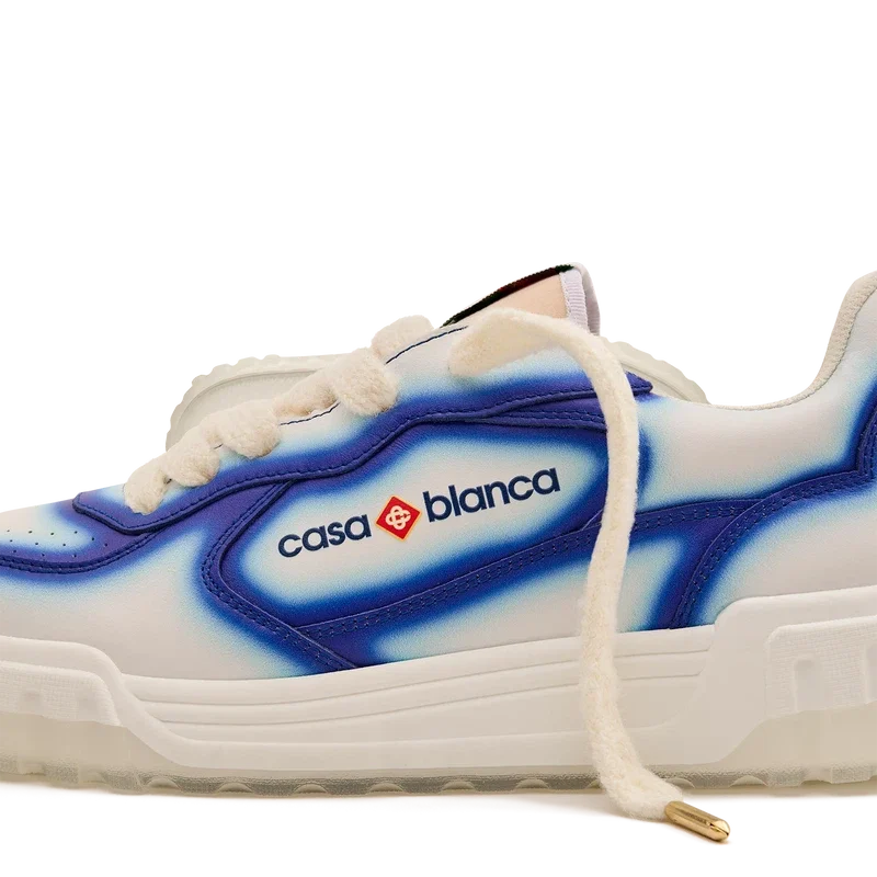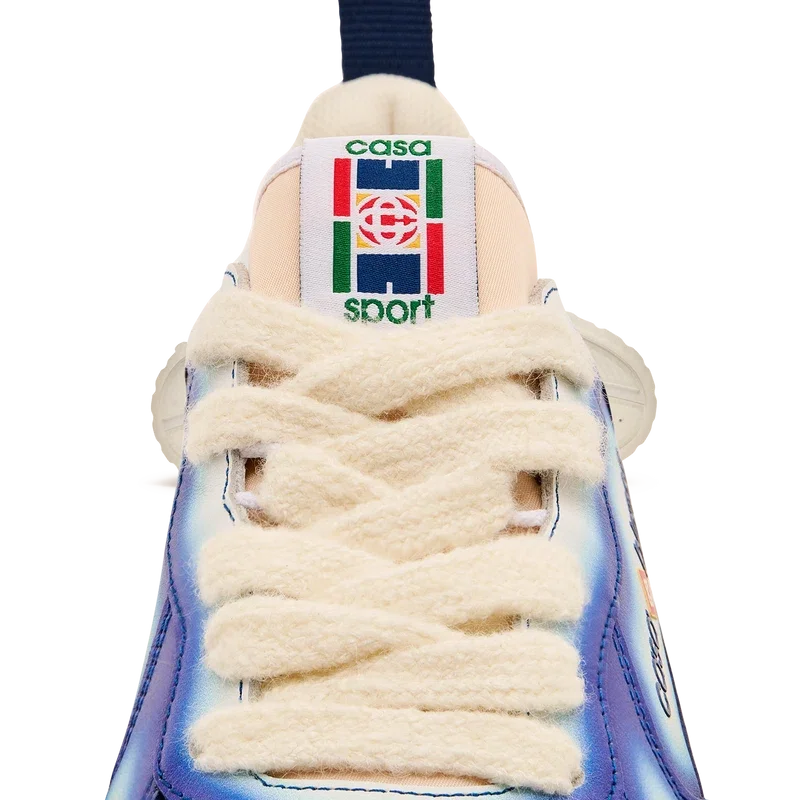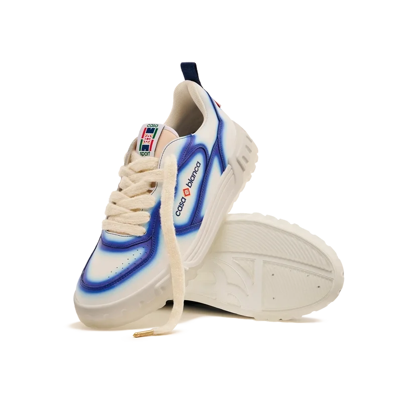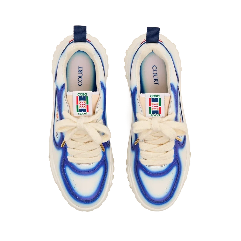 Le langage stylistique de la basket Court reflète les silhouettes emblématiques des années 90. Les couleurs présentes sur toute la semelle en caoutchouc combinent les codes raffinés du tennis et de l’architecture classique, créant une palette harmonisée sur l’ensemble de la chaussure, avec un accent mis sur les couleurs primaires rehaussées par le blanc du tennis pour créer une palette de couleurs à l’esprit sportif. La tige des Chaussures présente des lignes fluides et intégrées, en clin d’œil aux silhouettes emblématiques des années 90. Le logo Casablanca est bien visible partout, notamment avec le motif en losange signature de la marque sur le talon, le logo en silicone sur les panneaux latéraux, ainsi que l’étiquette tissée sur la languette et la semelle intérieure représentant un court de tennis, d’où le nom des Chaussures, la Court.