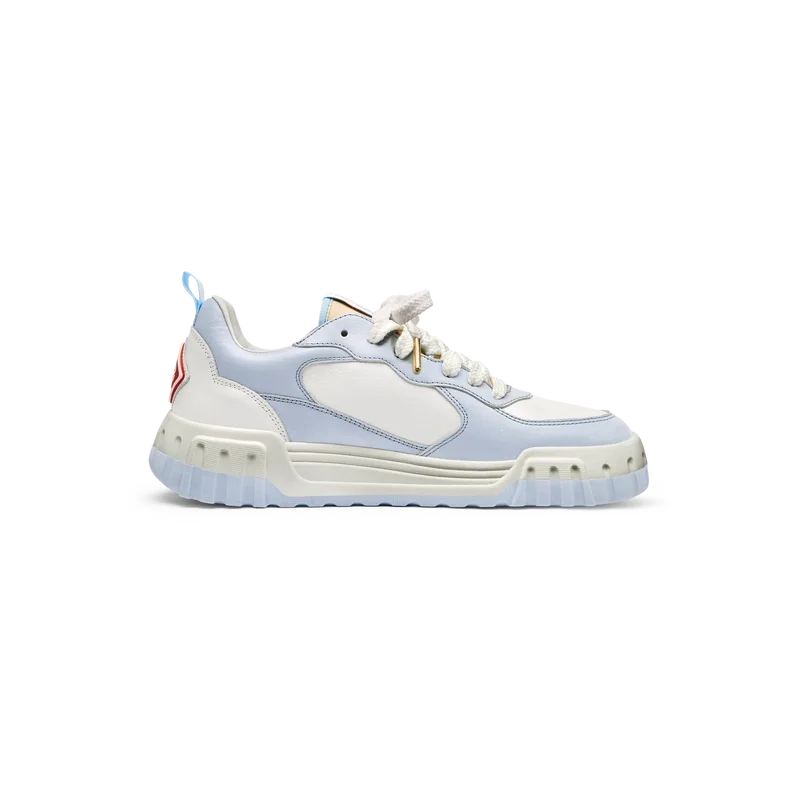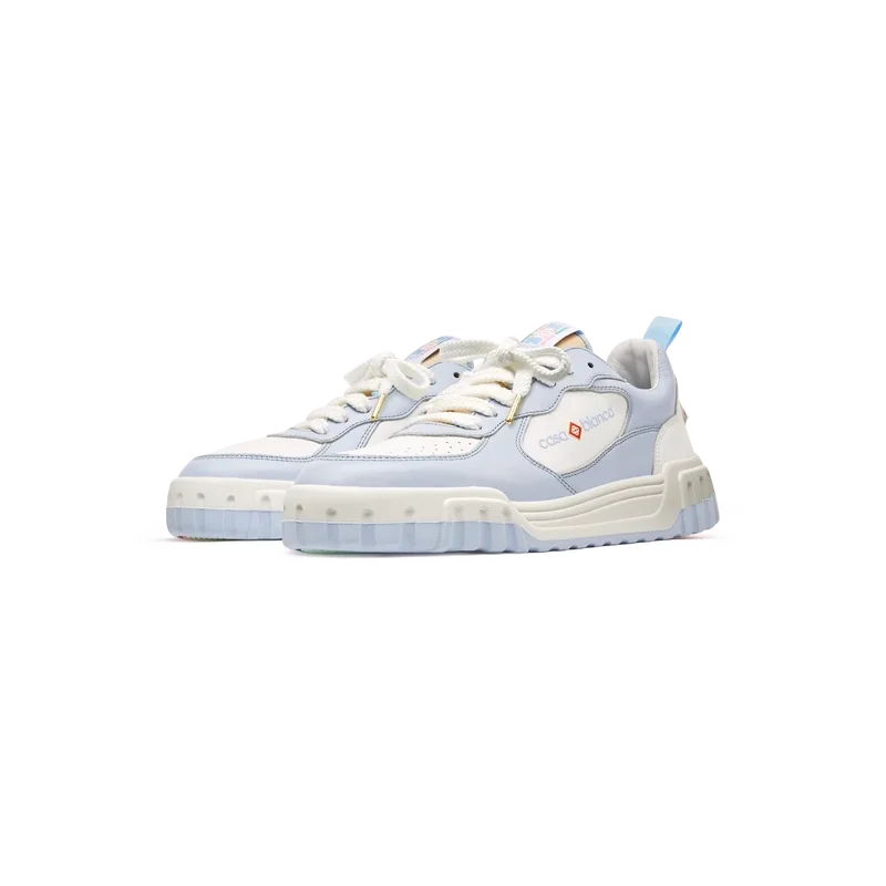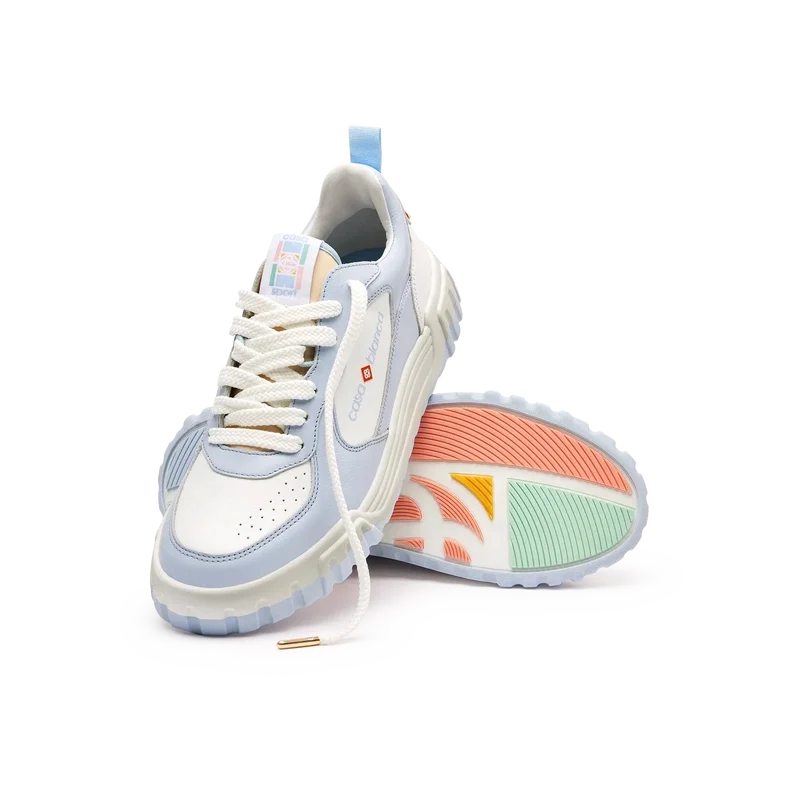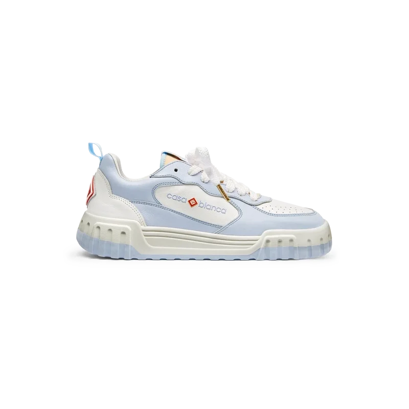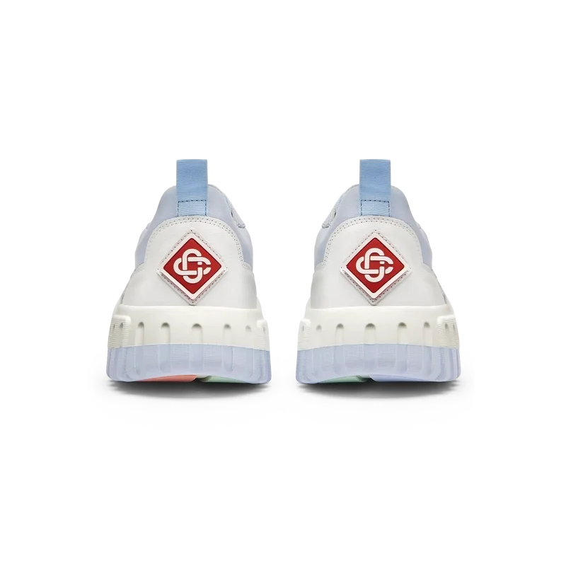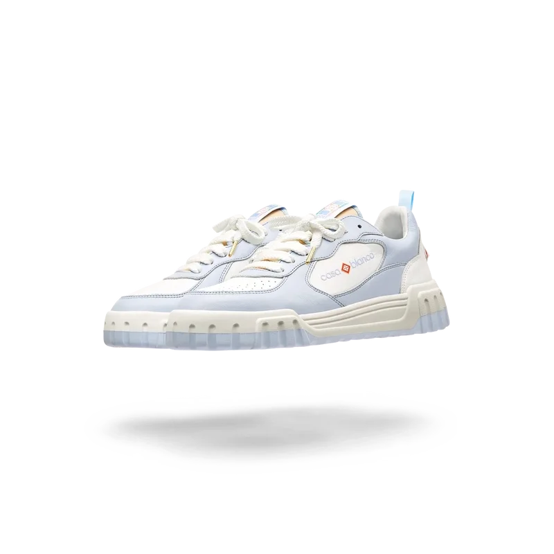 La tige de la chaussure présente des lignes fluides et intégrées, en clin d’œil aux silhouettes emblématiques des années 90. Le logo Casablanca est bien visible partout, notamment grâce au motif en losange signature de la marque sur le talon, au logo en silicone sur les panneaux latéraux, ainsi qu’à l’étiquette tissée sur la languette et à la semelle intérieure représentant un court de tennis, d’où le nom de la chaussure, la Court.