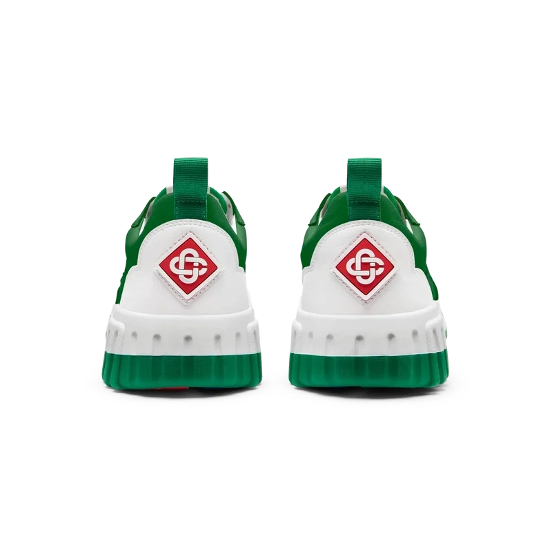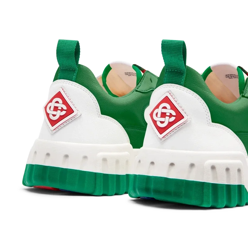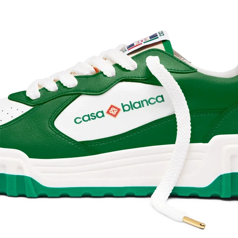 Le logo Casablanca est bien visible partout, notamment grâce au motif en diamant emblématique de la marque sur le talon, au logo en silicone sur les empiècements latéraux, ainsi qu’à l’étiquette tissée sur la languette et à la semelle intérieure représentant un court de tennis, d’où le nom de la chaussure, « The Court ».