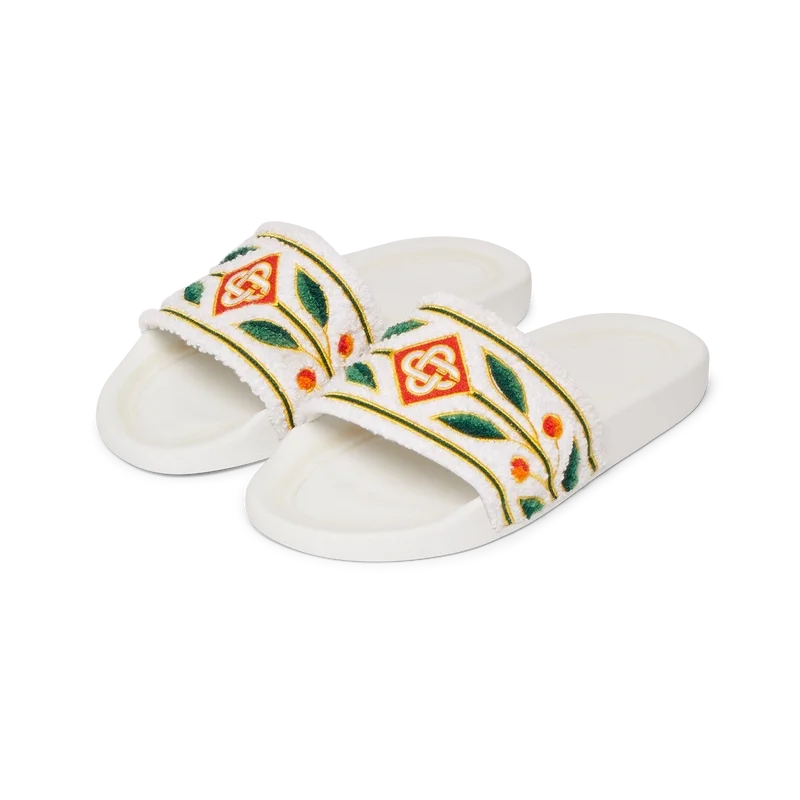 Les sandales Terry brodées pour homme sont confectionnées en tissu éponge et arborent le logo en forme de losange de la maison ainsi que le motif Laurel emblématique sur leur tige. Elles sont dotées d’une semelle intérieure sculptée pour un confort accru et d’une semelle extérieure en caoutchouc texturé alliant performance et décontraction.