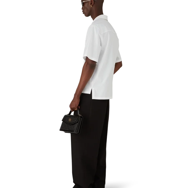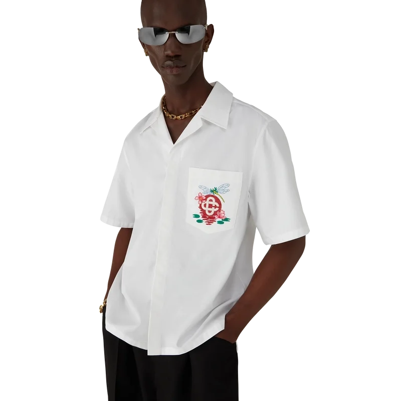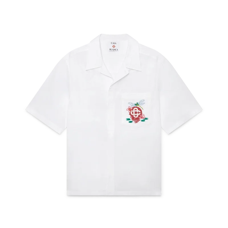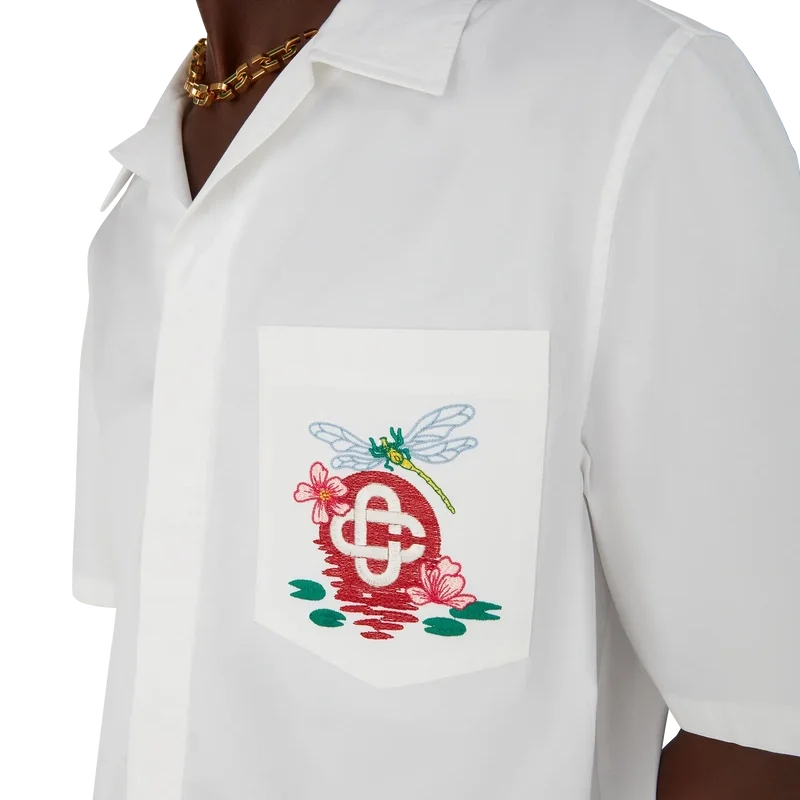 La chemise à shorts en popeline de coton brodée est un modèle classique confectionné dans un tissu en coton orné d’un motif saisonnier où la libellule occupe le devant de la scène en tant que symbole clé, offrant un contraste plus doux et plus délicat, tandis que les fleurs de lotus et le reflet du soleil sur l’eau s’inspirent de la symbolique de Casablanca liée à la nature. Elle est dotée d’un col cubain, d’une fermeture à boutons, d’une poche poitrine, de boutons en corozo arborant le logo Cc entrelacé emblématique de la marque, et d’un ourlet asymétrique.