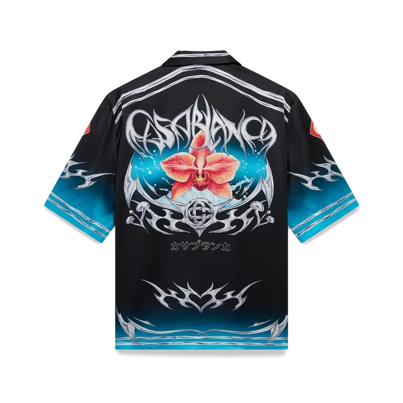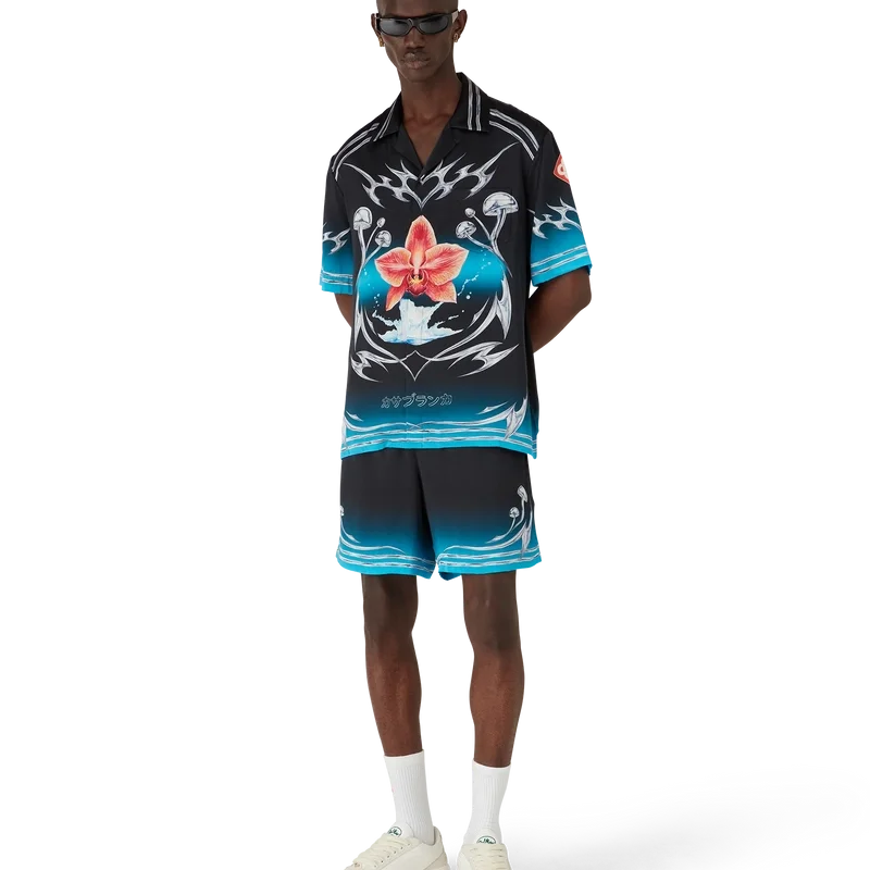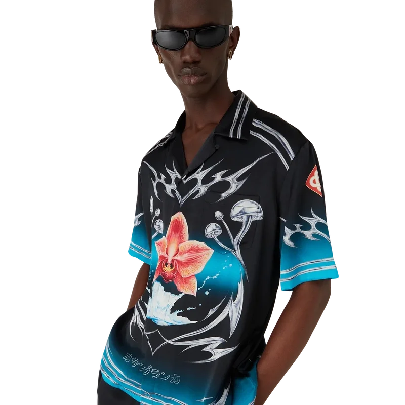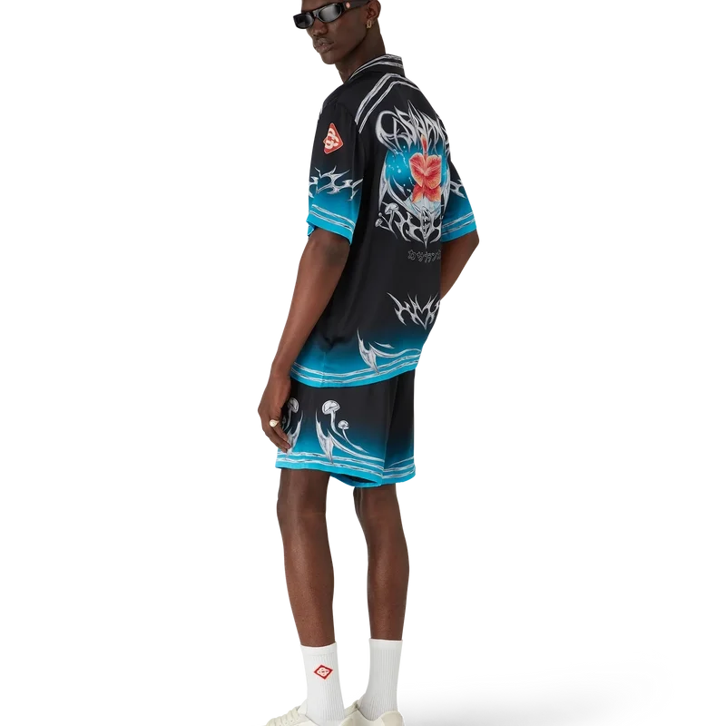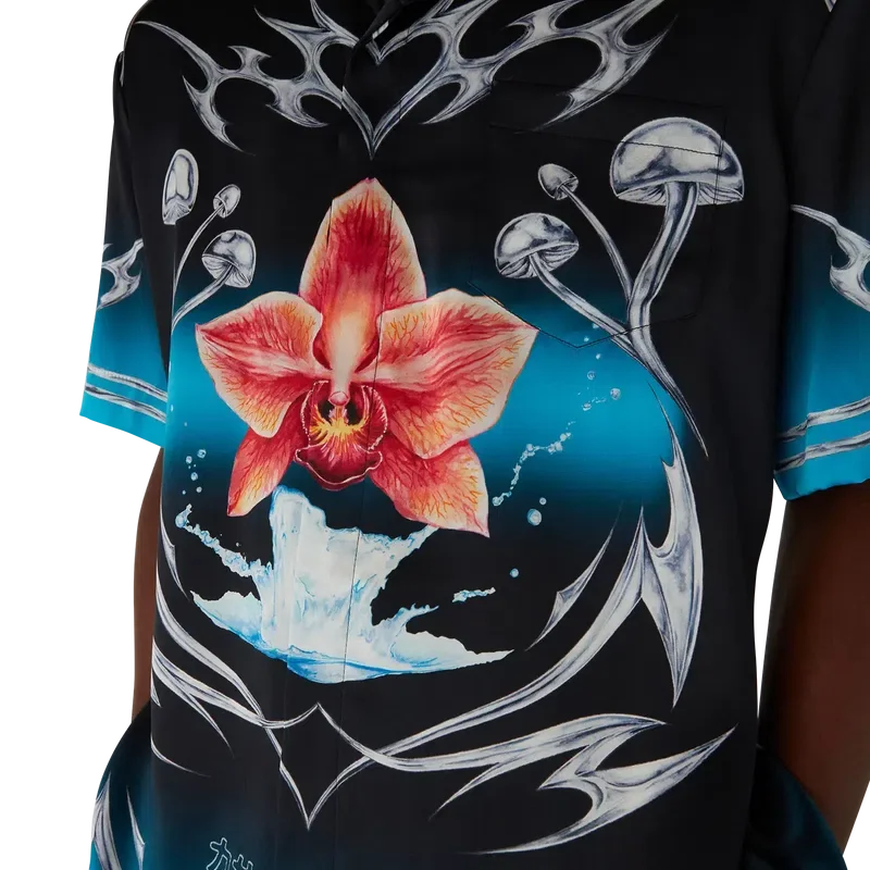 La chemise à manches courtes en satin de soie Blades présente un motif imprimé jouant sur le contraste entre deux sensations opposées : la netteté de la lame et le chrome argenté froid, contrastant avec la chaleur de la nature, comme les tons roses et rouges vifs d’une fleur d’orchidée. L’ajout de l’eau apporte une touche de fraîcheur et de vivacité au motif. Elle est dotée d’un col cubain, d’une poche poitrine, d’une fermeture à boutons et des boutons en corozo entrelacés emblématiques de la marque.