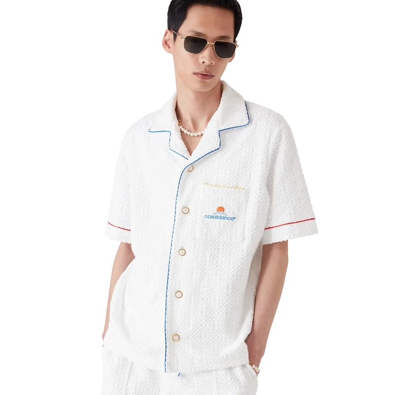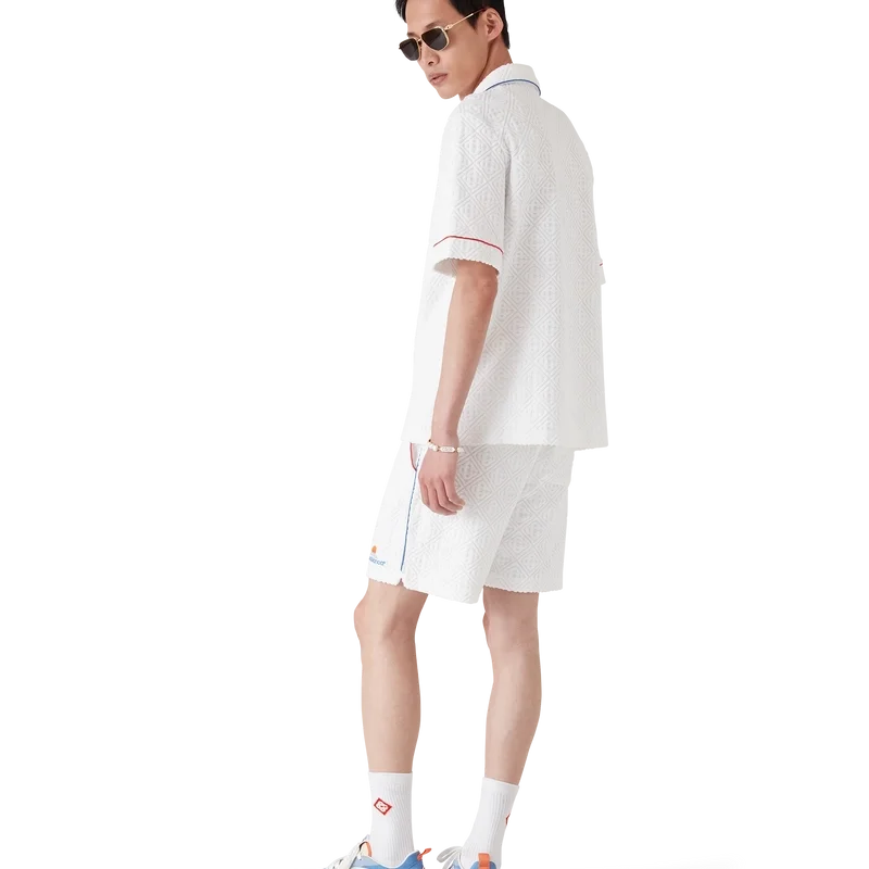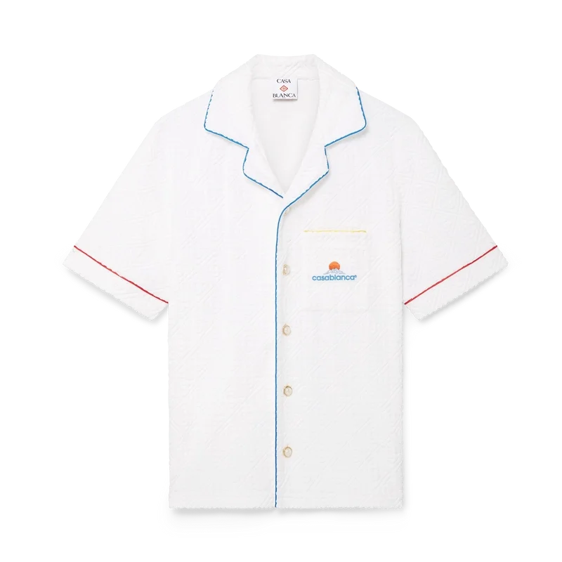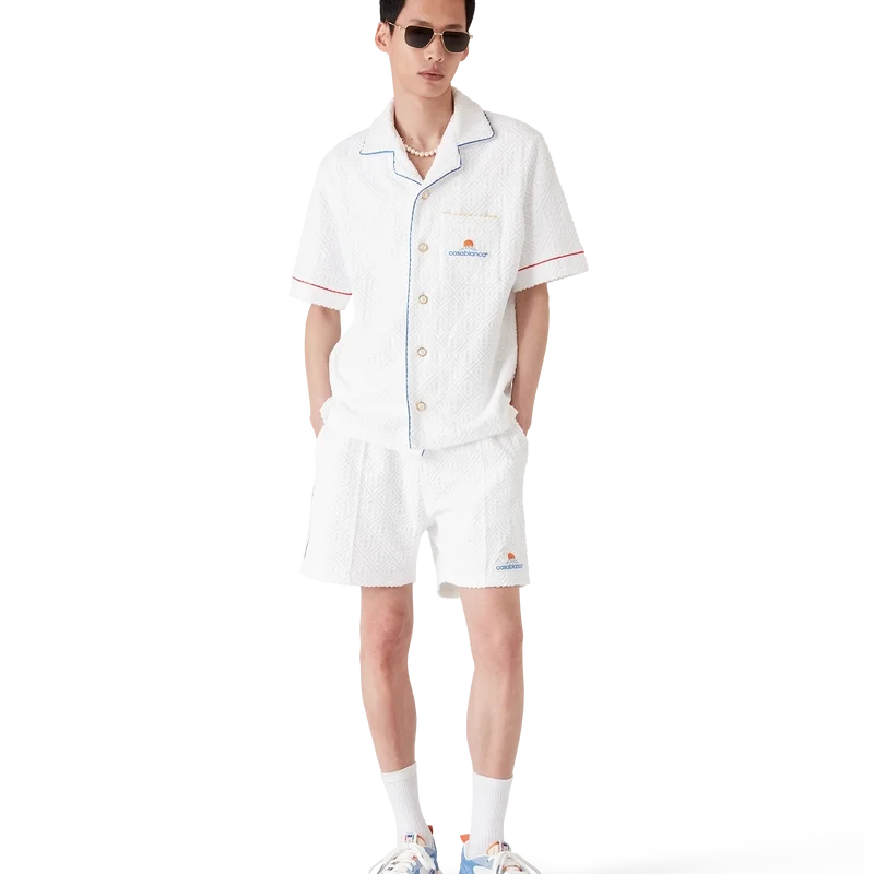 La chemise à manches courtes en tissu éponge Monogram est un modèle classique confectionné dans un tissu éponge Monogram. Elle est dotée d’une fermeture à boutons, de boutons signature dorés à bordure nacrée, d’une poche poitrine et de passepoils sur le col, la patte de boutonnage, les poignets et la poche poitrine.