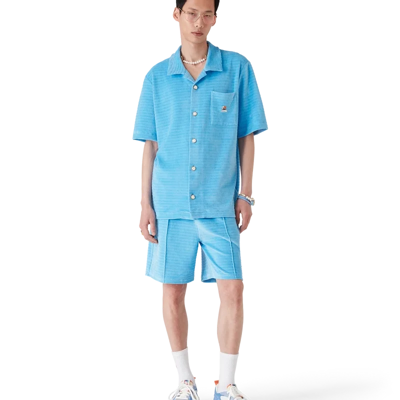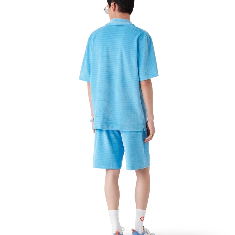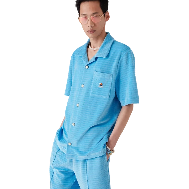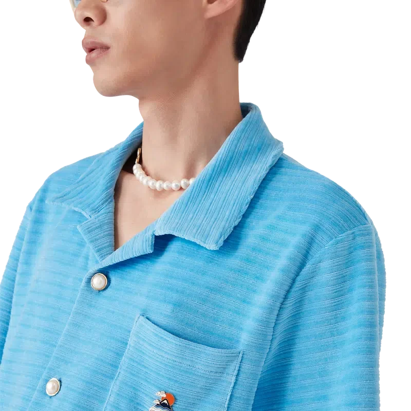 La chemise à manches courtes en velours rayé est un modèle classique confectionné dans un tissu en velours rayé. Elle est dotée d’un col cubain, d’une fermeture à boutons, de boutons perlés à bordure dorée emblématiques, d’une poche poitrine et de fentes latérales.