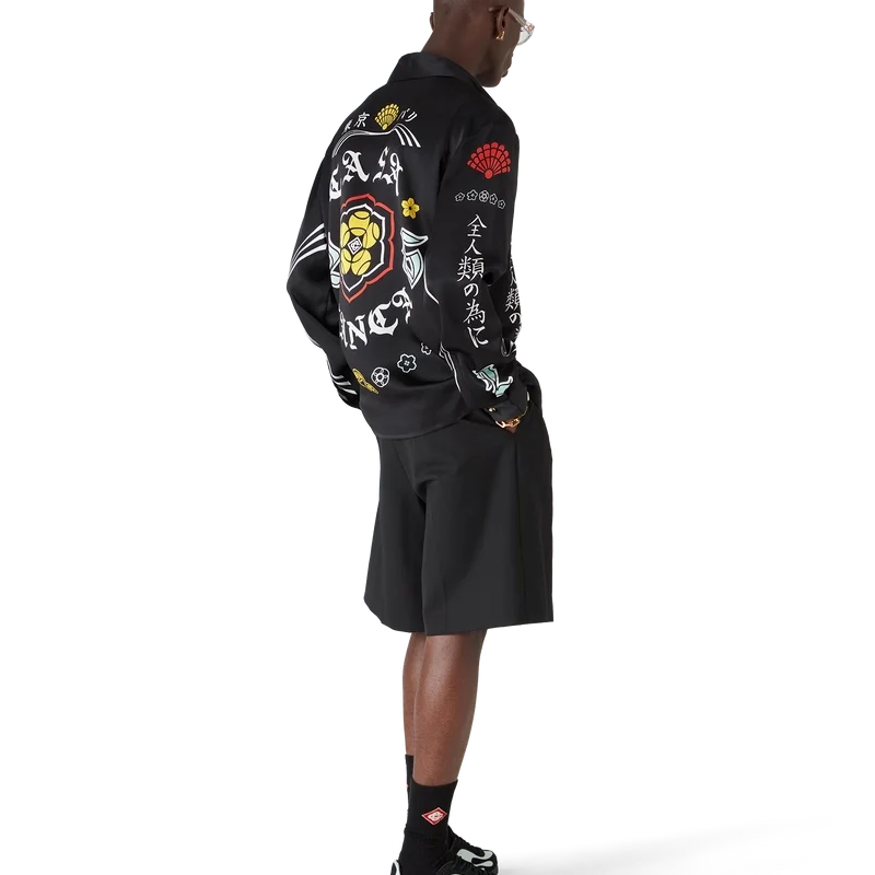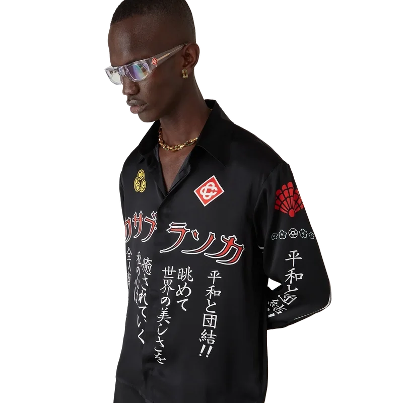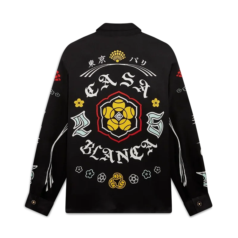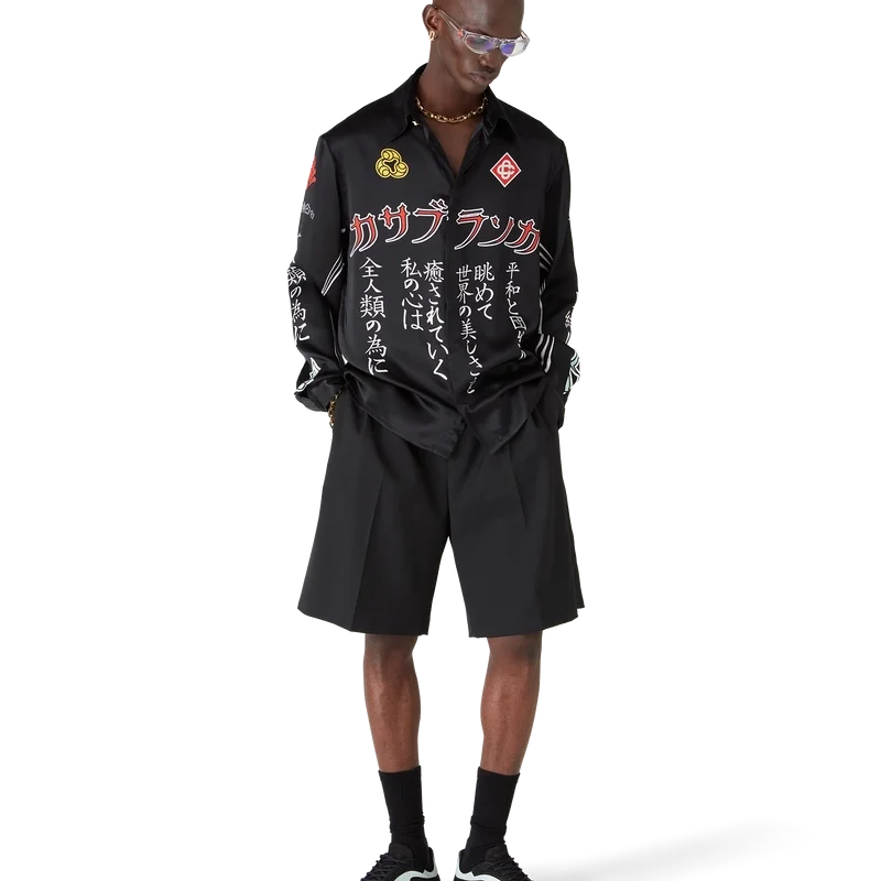 La chemise en soie à manches longues Emblem présente un motif imprimé inspiré des illustrations de la saison. Nous avons puisé notre inspiration dans la sous-culture japonaise du BōSōZoku pour l’un de nos thèmes principaux. Le contraste entre les éléments graphiques et le texte nous a fortement rappelé l’ambiance de Casablanca. Nous avons créé notre propre interprétation en y intégrant des phrases qui décrivent la marque, comme « Contempler la beauté du monde ». La mise en page est non conventionnelle, mais la composition est soigneusement équilibrée, ce qui lui confère un aspect à la fois unique et harmonieux. Elle est agrémentée d’un col en pointe, d’une fermeture à boutons, de boutons en corozo arborant le logo Cc entrelacé, ainsi que de boutons émaillés à bordure dorée aux poignets et au col.