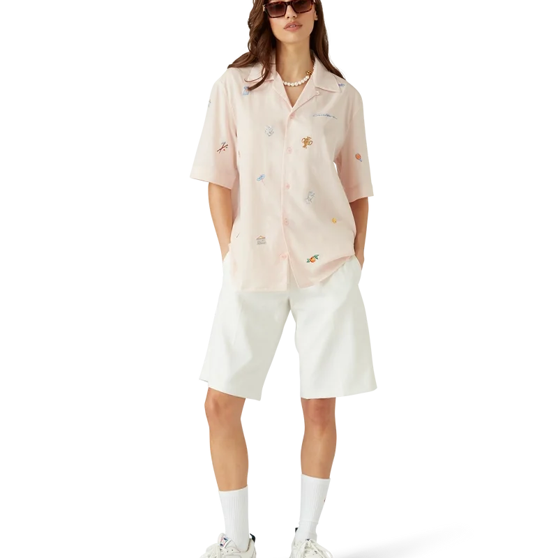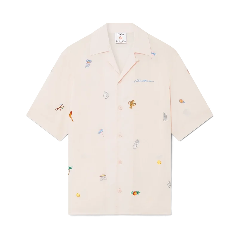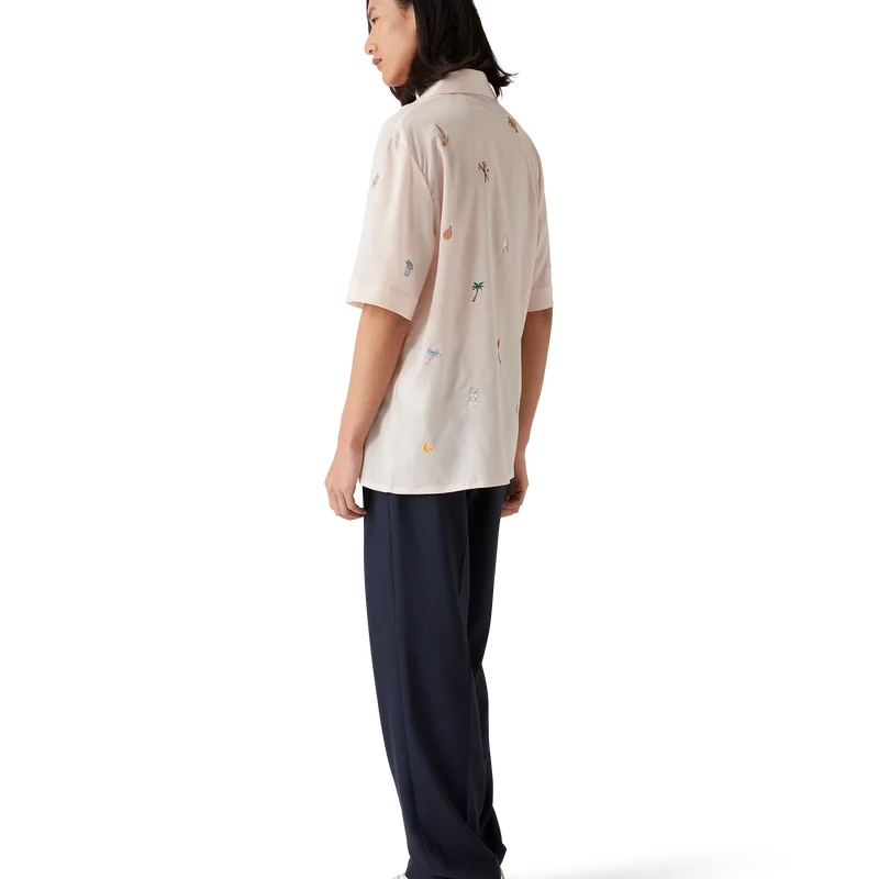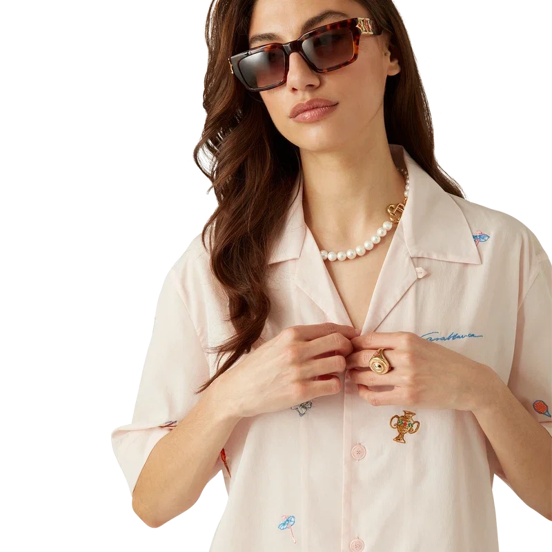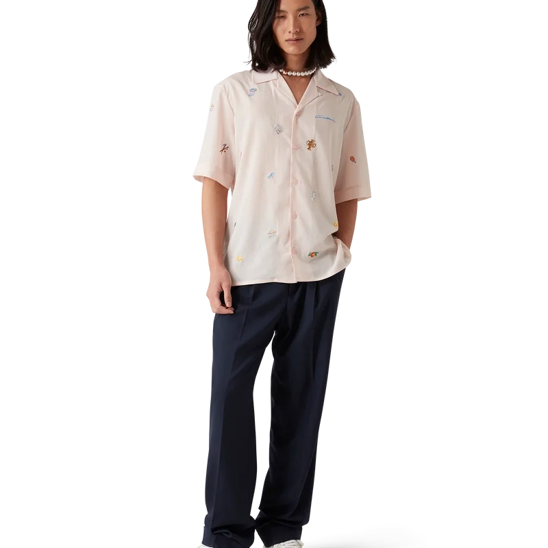 La chemise à motifs brodés est un modèle à manches courtes confectionné dans un tissu brodé, orné de motifs représentant la symbolique de la Maison à travers la nature, le tennis et l’architecture. Elle est dotée d’une fermeture à boutons, de boutons en corozo arborant le logo CC entrelacé et d’un col cubain.