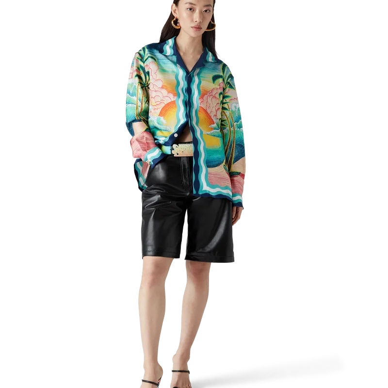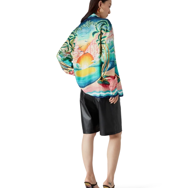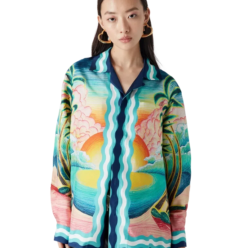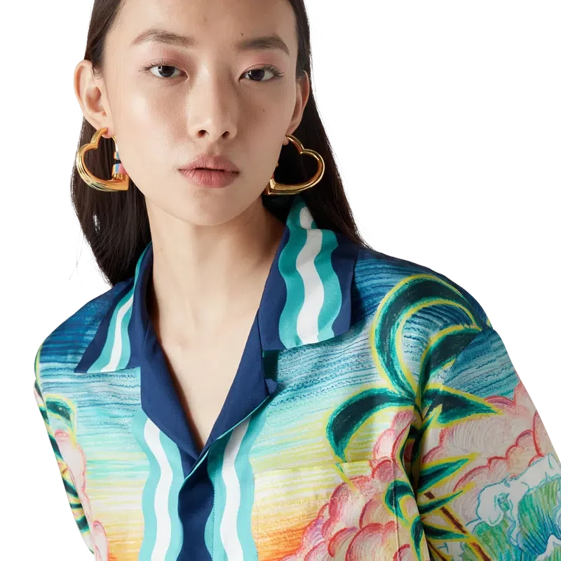 La chemise en soie Danse De La Mer est un modèle à manches longues entièrement imprimé, présentant des scènes peintes à la main créées spécialement pour la collection et confectionnée en soie. Elle est dotée d’une fermeture à boutons, de boutons en corozo avec le logo CC entrelacé, de boutons émaillés à bordure dorée emblématiques, ainsi que de détails rayés inspirés du motif Memphis Wave sur l’ourlet, les poignets, le col et la patte de boutonnage.