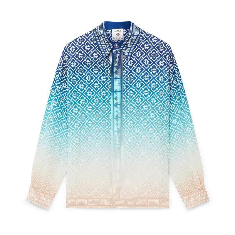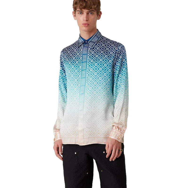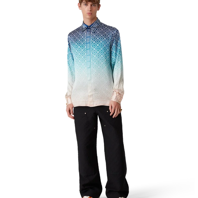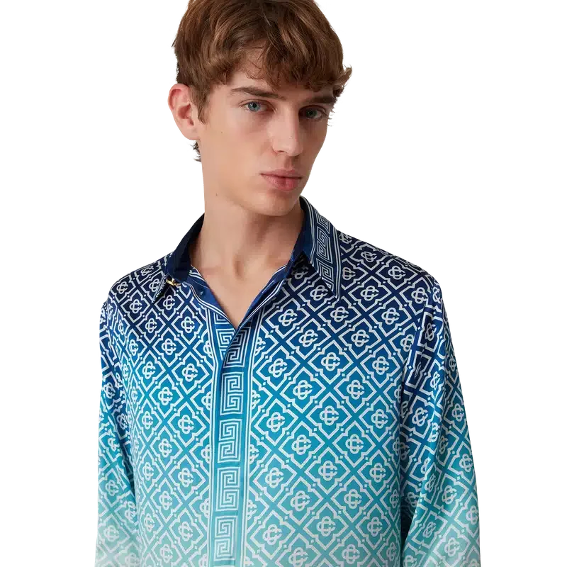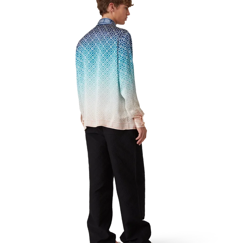 La chemise en soie à motif dégradé jacquard est un modèle à manches longues entièrement imprimé, confectionné dans un satin de soie à motif Monogram dégradé. Elle est dotée d’un col, de boutons émaillés à bordure dorée sur les manches et le col, d’une fermeture à boutons sur le devant avec des boutons en corozo griffés CC entrelacés, et de détails de bordure inspirés du motif grec sur le col, les poignets, la patte de boutonnage et l’ourlet.