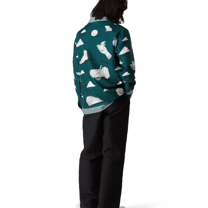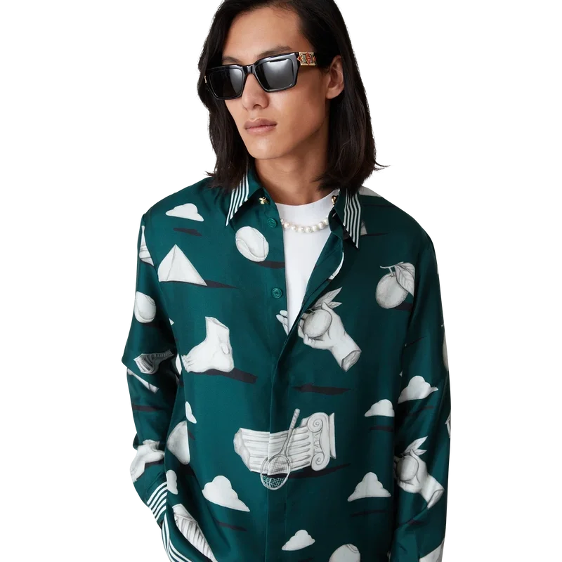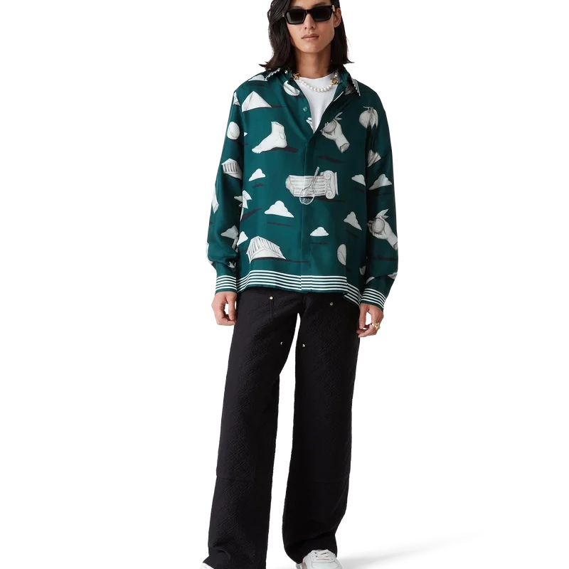 La chemise en soie Metaphysical présente un motif imprimé sur toute la surface. Confectionnée en twill de soie, elle arbore des illustrations représentant les éléments de design phares de la marque. Elle est agrémentée de boutons émaillés dorés emblématiques aux poignets et au col, d’une fermeture à boutons sur le devant avec des boutons en corozo Cc entrelacés, d’un col en pointe et de détails rayés sur le col, les poignets et l’ourlet.