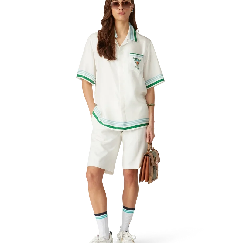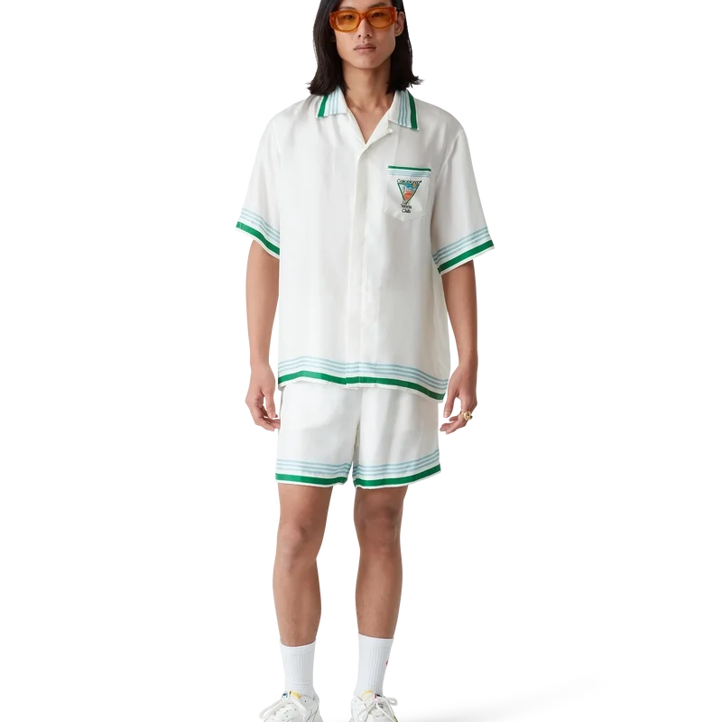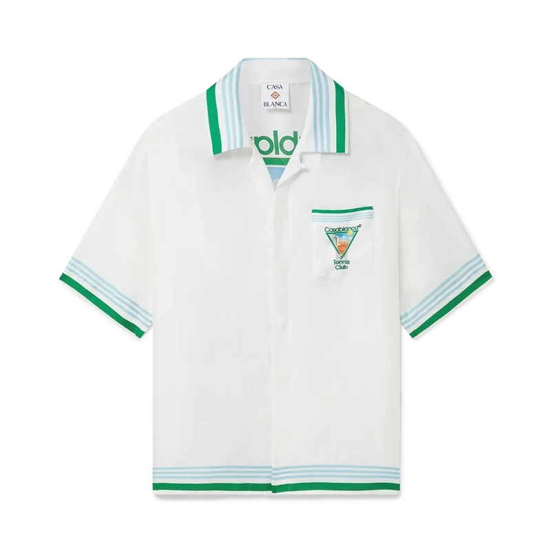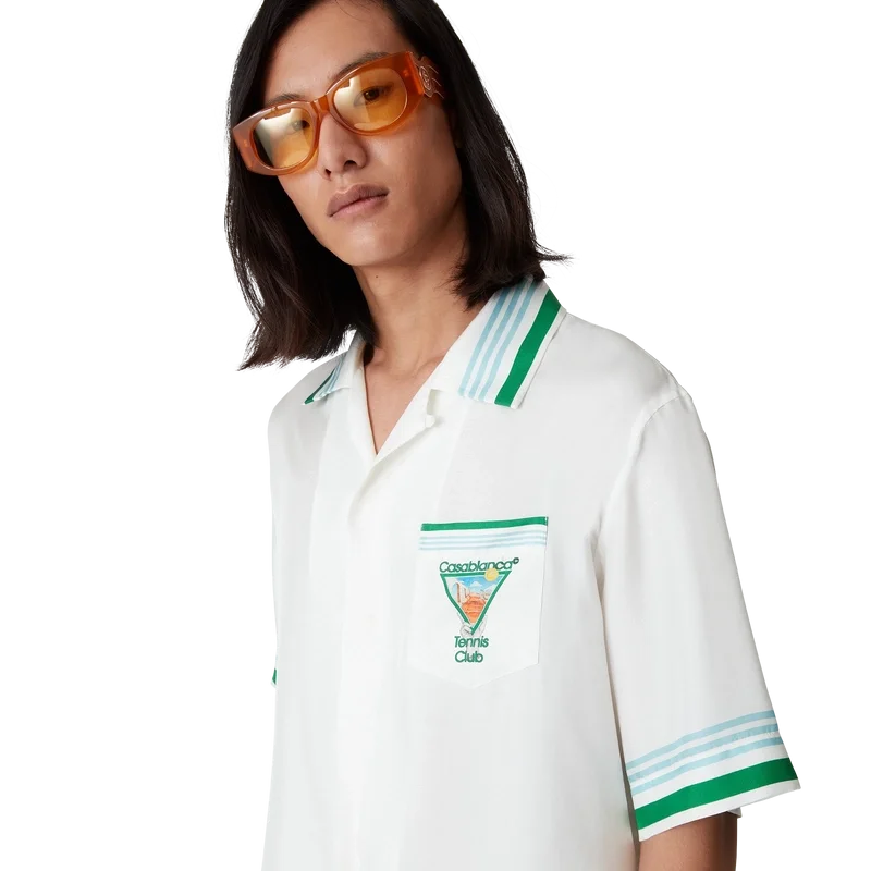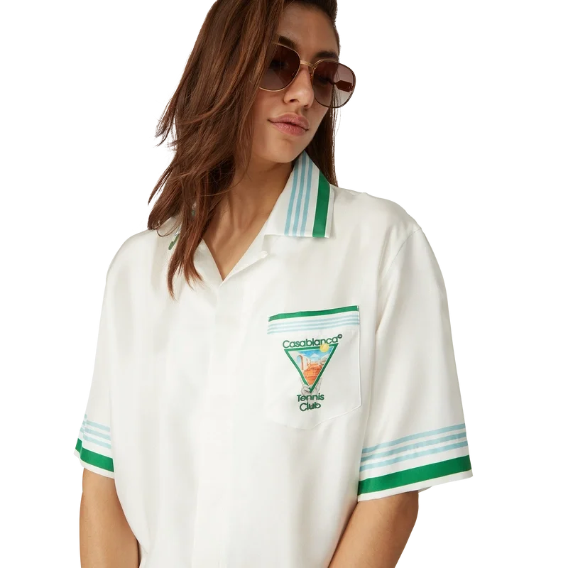 La chemise en soie Metaphysical Tennis Icon est un modèle à manches courtes confectionné dans un twill de soie et orné du motif saisonnier de la Maison, inspiré par l’étude continue de la beauté classique et du charme contemporain de la Grèce antique, intégrant les éléments de design de la Maison que sont le tennis, la nature et l’architecture. Elle est dotée de boutons en corozo arborant le logo CC entrelacé emblématique, d’une fermeture à boutons dissimulée, d’un col cubain, d’une poche poitrine et de détails à rayures bleues, blanches et vertes sur les poignets, le col et l’ourlet.