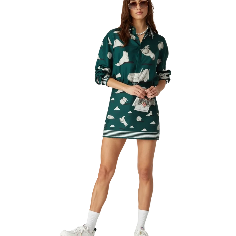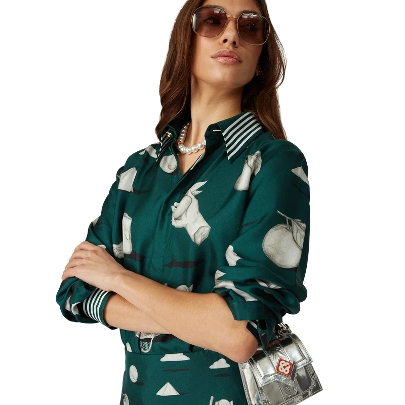 La chemise en soie Metaphysical présente un motif imprimé sur toute la surface. Confectionnée en twill de soie, elle arbore des illustrations représentant les éléments de design phares de la marque. Elle est agrémentée de boutons émaillés dorés emblématiques aux poignets et au col, d’une fermeture à boutons sur le devant avec des boutons en corozo Cc entrelacés, d’un col en pointe et de détails rayés sur le col, les poignets et l’ourlet.