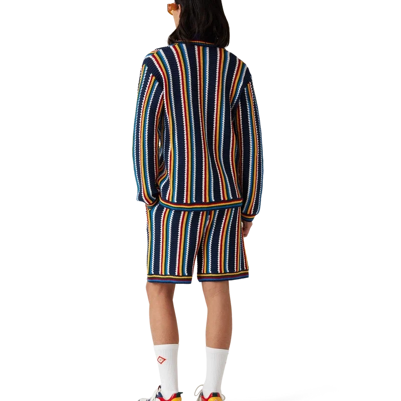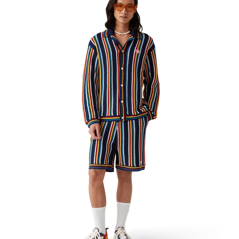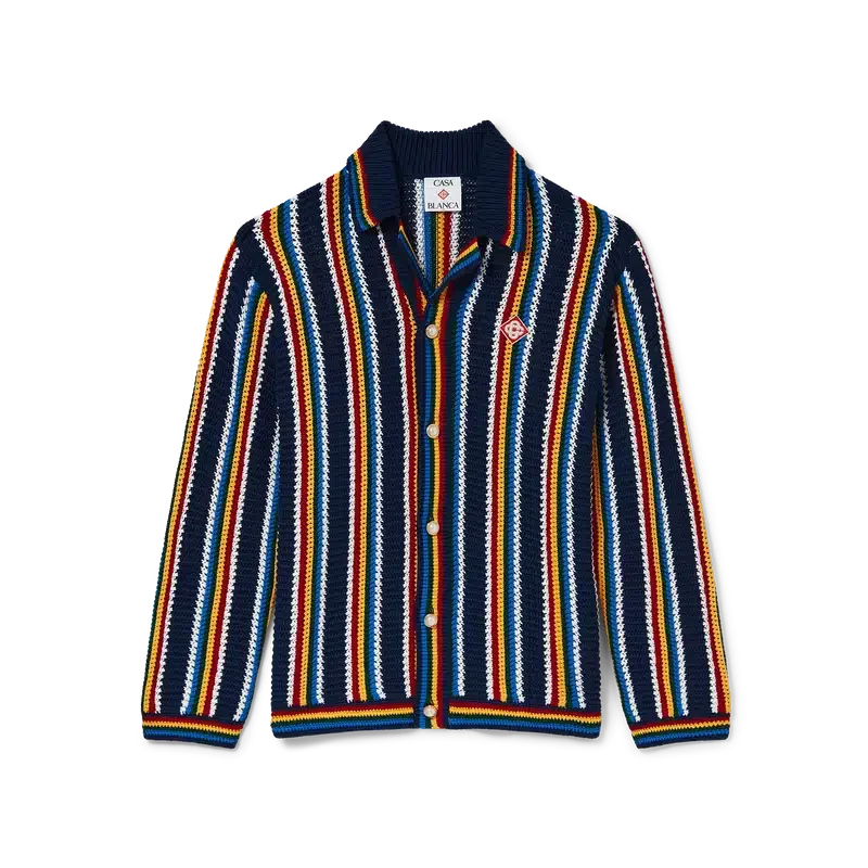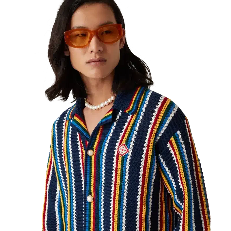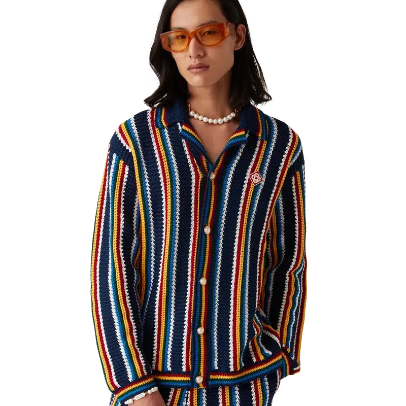La chemise rayée en crochet est un modèle texturé à manches longues, confectionné dans un tissu en coton crocheté et orné du logo en losange emblématique de la maison. Elle est dotée d’un col, de poignets, d’un ourlet et d’une patte de boutonnage en côtes, de boutons perlés à bordure dorée emblématiques et d’une fermeture à boutons sur le devant.