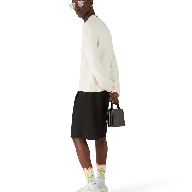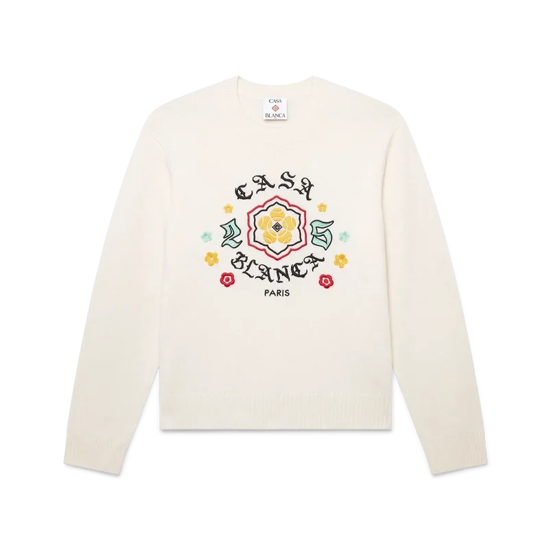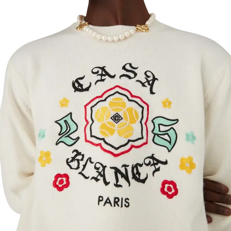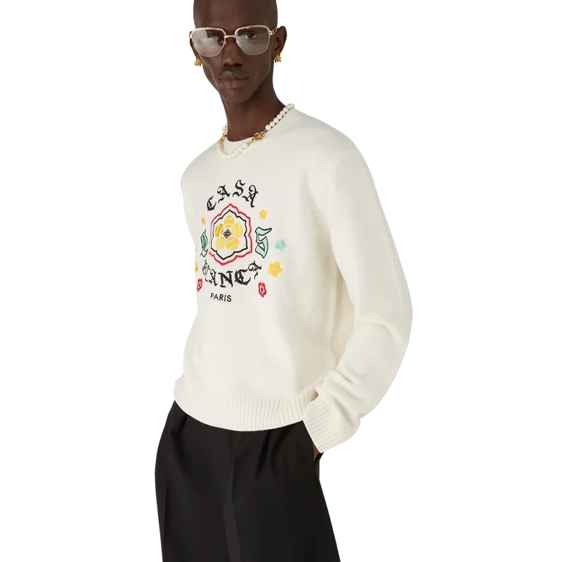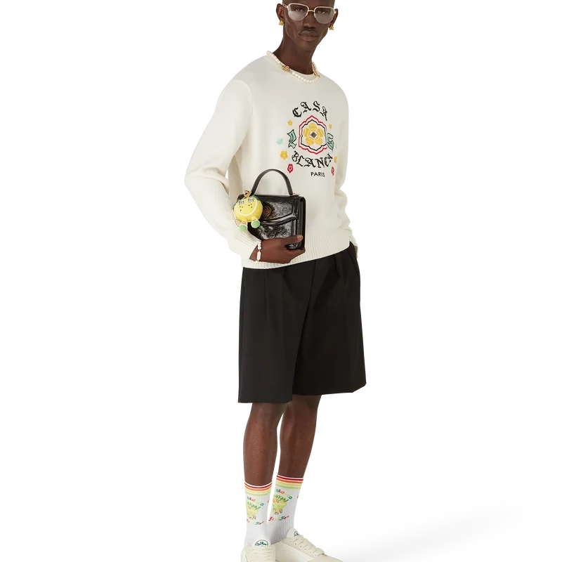 Le pull à col rond en maille mérinos Emblem est un pull à manches longues orné du motif de cette saison, pour lequel nous nous sommes inspirés de la sous-culture japonaise BōSōZoku comme l’un de nos thèmes principaux. Le contraste entre les éléments graphiques et le texte nous a fait penser à Casablanca. Nous avons créé notre propre interprétation de l’art BōSōZoku, en y intégrant des phrases qui décrivent la marque, comme « Contempler la beauté du monde ». La mise en page est non conventionnelle, mais la composition est soigneusement équilibrée, ce qui lui confère une atmosphère à la fois unique et harmonieuse. Le tout est complété par un col, des poignets et un ourlet côtelés classiques.
