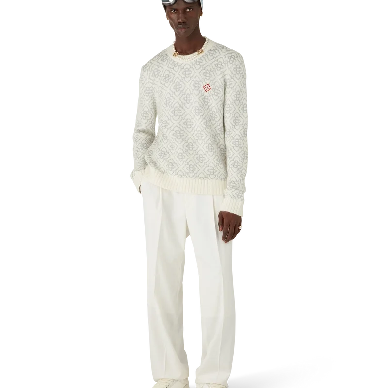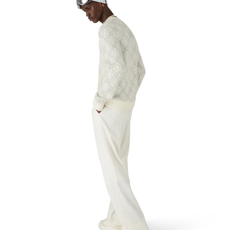 Le Ski Jumper est un modèle Apras-Sport raffiné en tissu mohair, orné du motif monogramme blanc et gris de la maison, inspiré des motifs de givre sur les fenêtres des fermes traditionnelles japonaises. S’inspirant des cristaux de neige sur les bosquets de bambous, ce modèle allie l’élégance sport-loisirs à la fonctionnalité alpine. Il est doté d’un col rond et d’un ourlet en tricot côtelé.