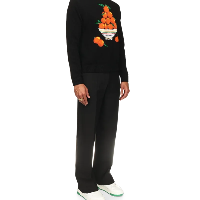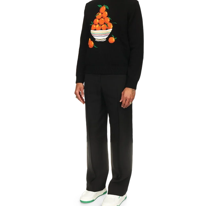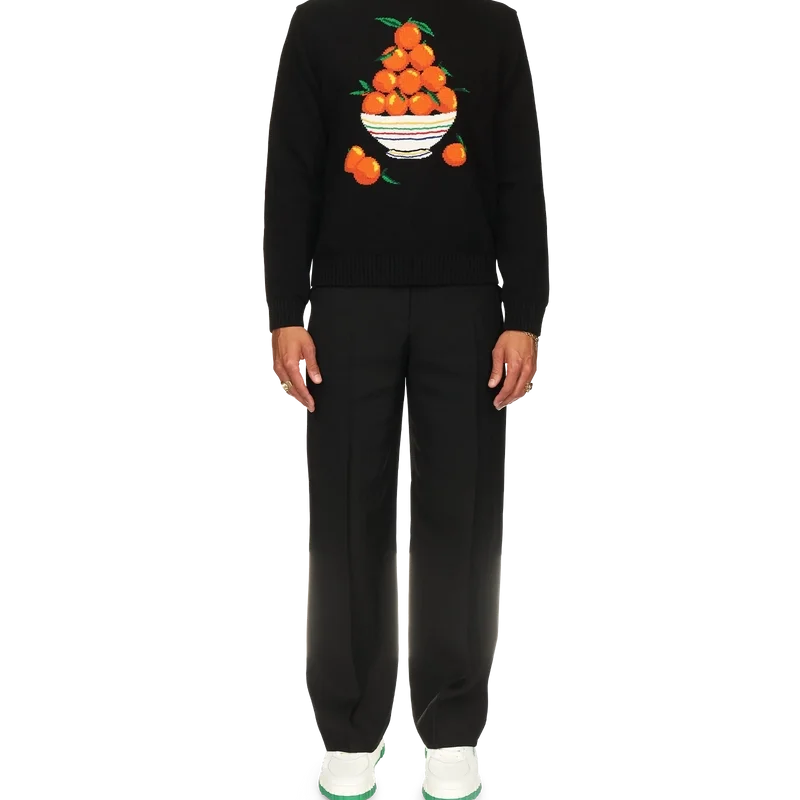 Le pull « Pyramide d’Oranges » est confectionné en coton tricoté 100 % et arbore le motif iconique de la pyramide orange de la maison. Il est doté d’un col, de poignets et d’un ourlet côtelés, ainsi que d’une étiquette portant la marque Casablanca.