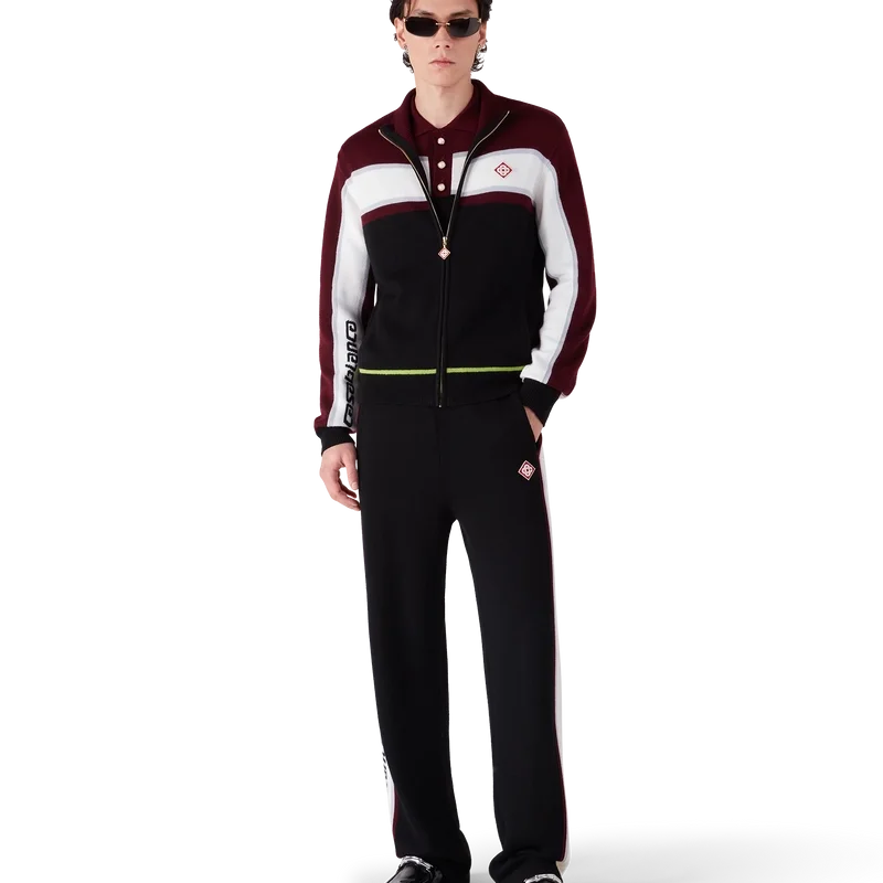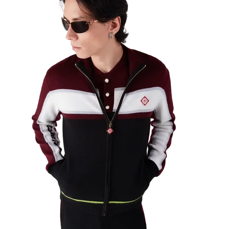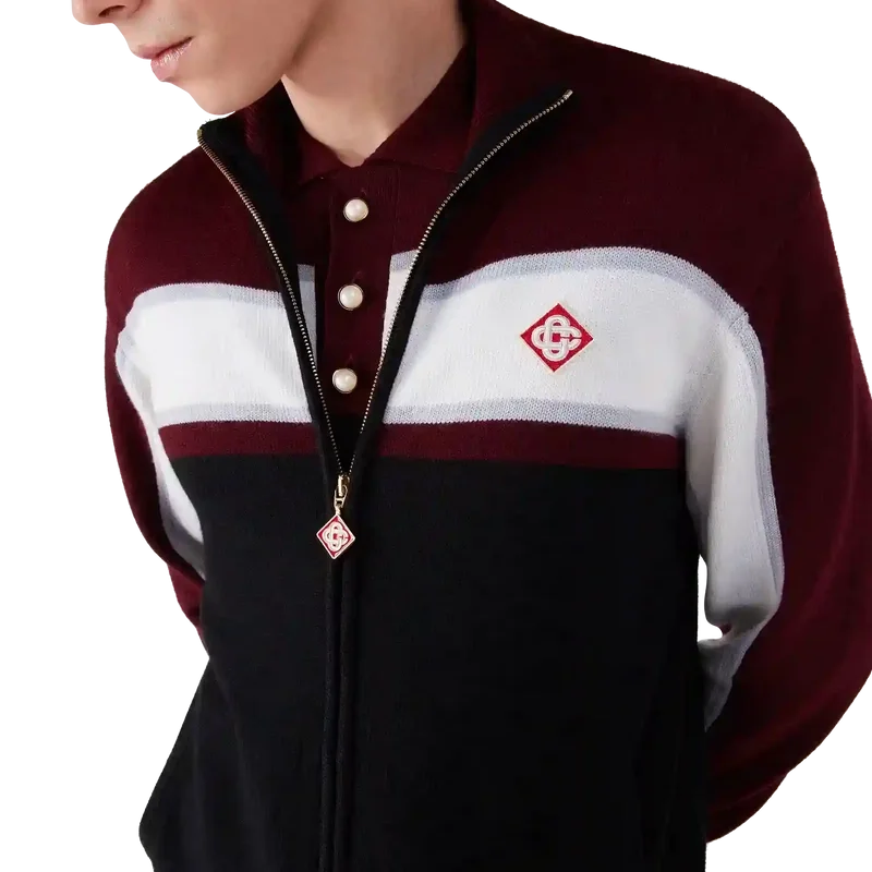 La veste en laine mérinos à rayures est un modèle Apras-Sport raffiné, doté d’une construction en tricot texturé. Elle présente une fermeture à glissière intégrale ornée du logo en losange emblématique de la maison, des détails rayés sur la poitrine et les manches, le logo Casablanca, ainsi qu’une coupe décontractée alliant aisance athlétique et sensibilité couture.