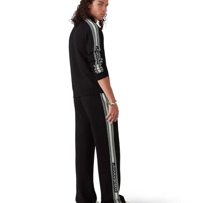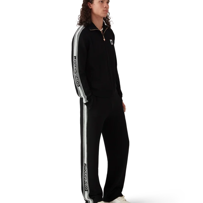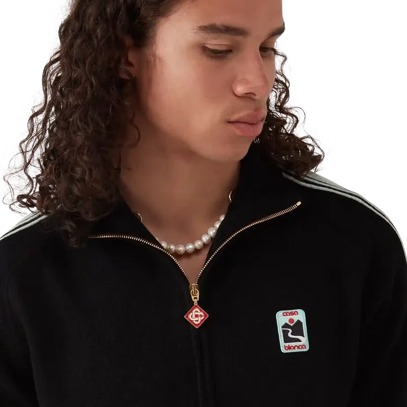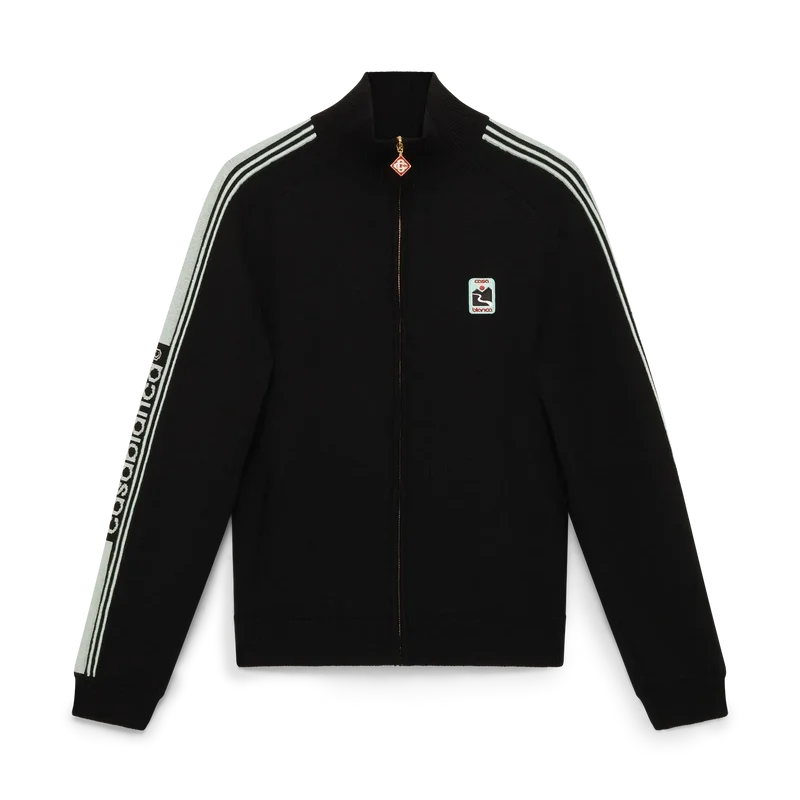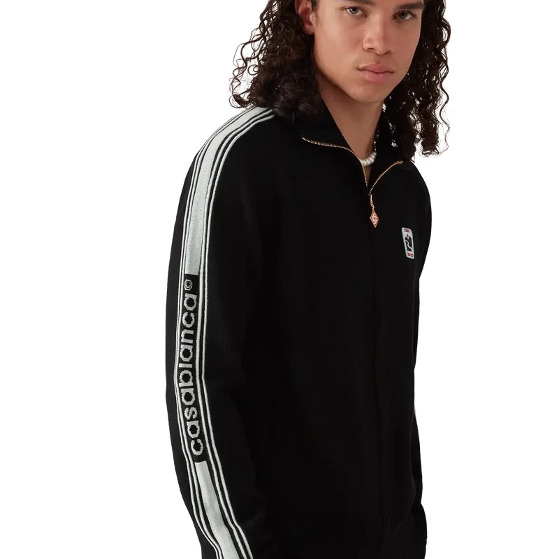 La veste de survêtement en tricot mérinos est un modèle à manches longues confectionné en laine mérinos. Elle est dotée d’une fermeture à glissière, d’une patte de boutonnage contrastée, d’un col polo, de rayures sur les manches, de poignets et d’un ourlet côtelés, ainsi que du logo Casablanca.