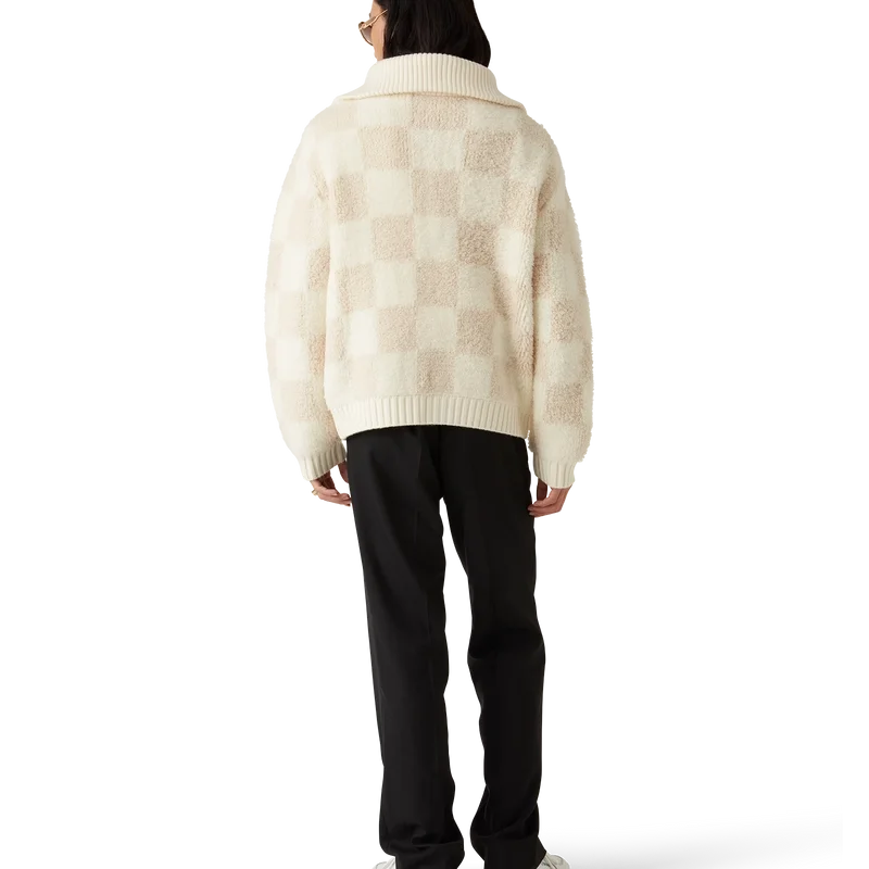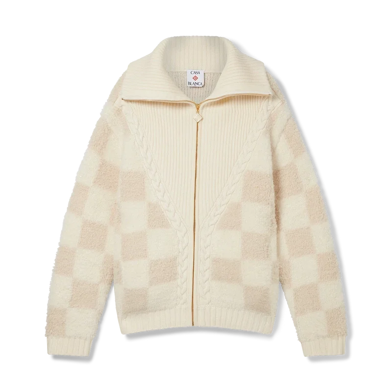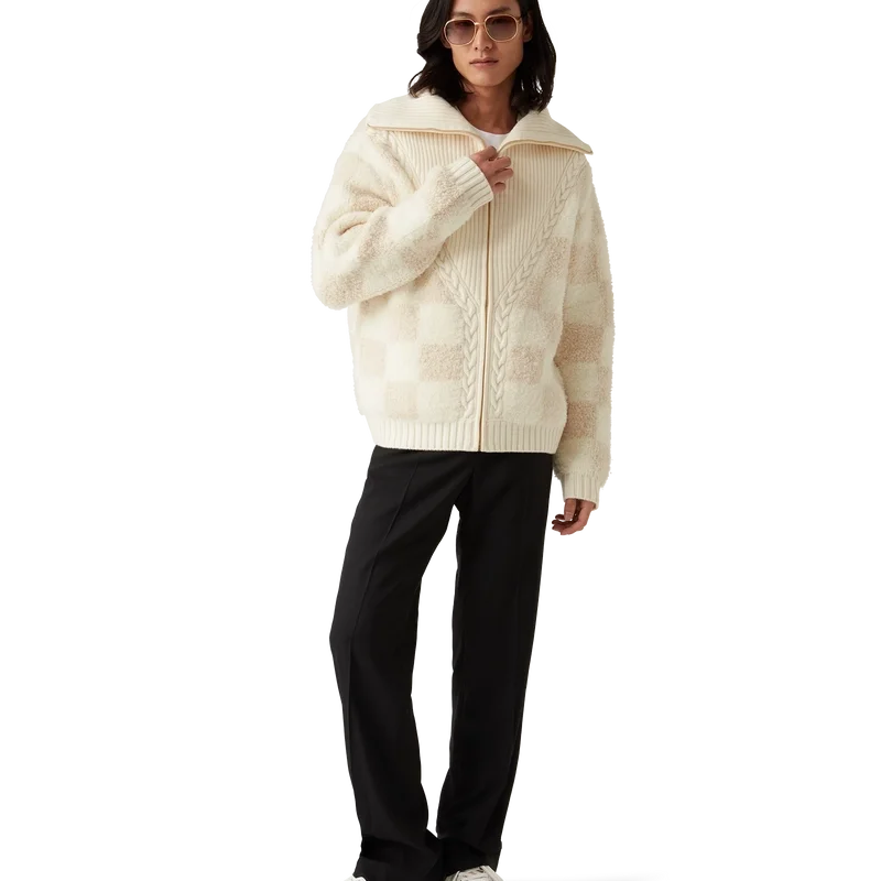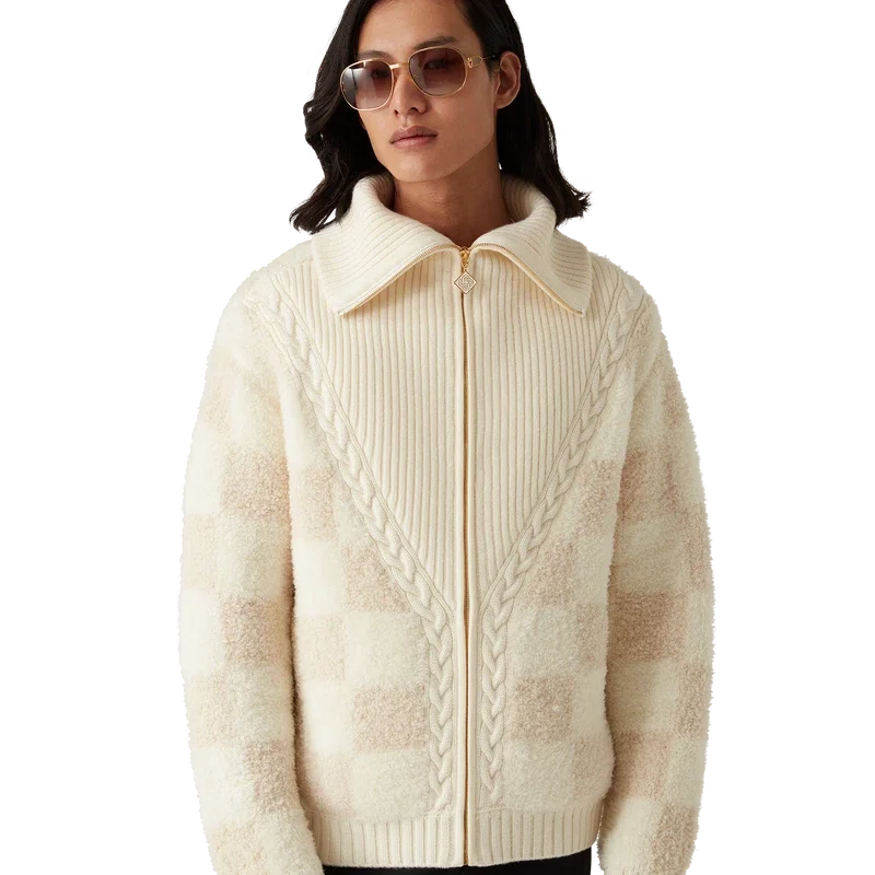 La veste polaire en laine mérinos est un modèle à manches longues en tricot, confectionné dans un tissu en laine mérinos à motif à carreaux. Elle est dotée d’une fermeture à glissière, d’un empiècement côtelé en V, d’un col, de poignets et d’un ourlet