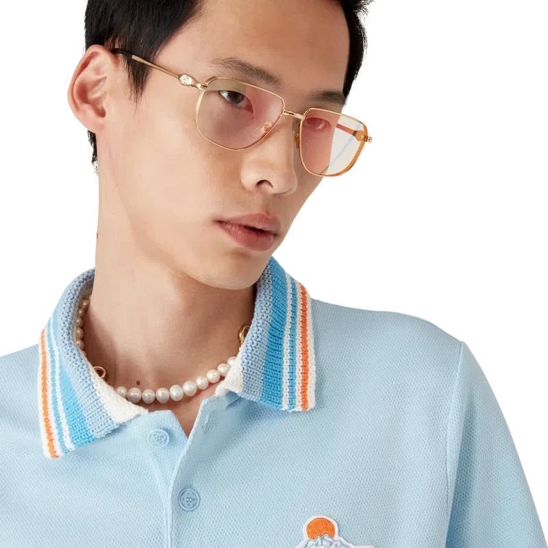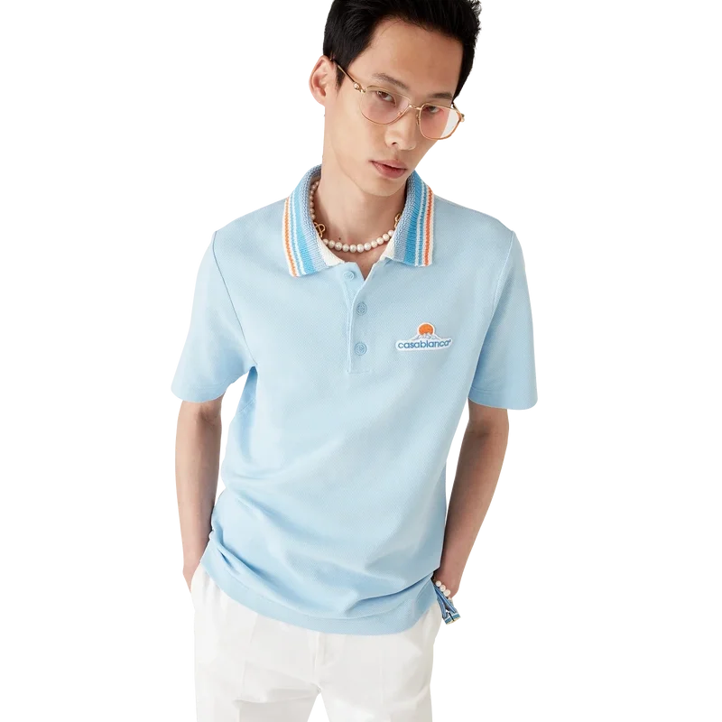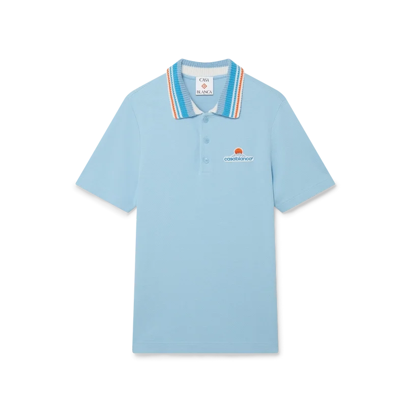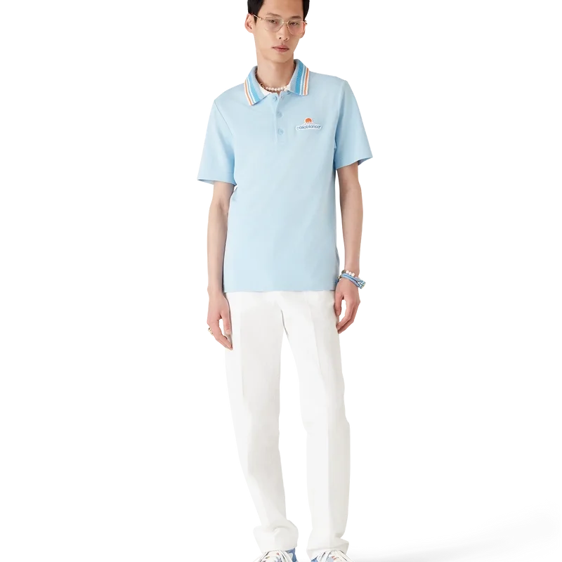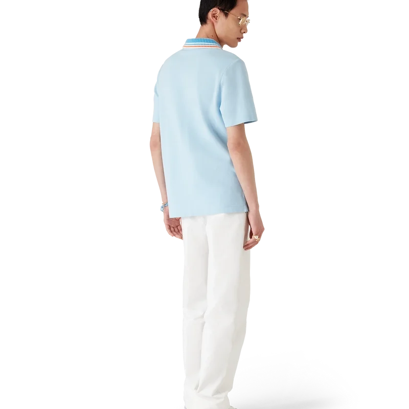 La chemise à manches courtes en piqué tricoté est un modèle classique orné du logo Casa Montagne : un logo qui ressemble d’abord à une montagne, mais qui, en y regardant de plus près, se lit comme « Casa ». Confectionnée en tissu piqué de coton biologique. Elle est dotée d’une fermeture à boutons, de boutons en corozo avec logo Cc entrelacé, et d’un col en tricot côtelé à rayures orange, bleues et blanches.