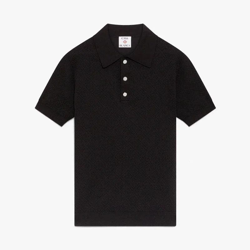 Le polo à manches courtes noir en pointelle Monogram est un modèle en maille raffinée, présentant une texture pointelle ajourée avec le motif Monogram emblématique de la Maison. Il est doté d’un col et d’une patte de boutonnage côtelés, d’une fermeture à boutons, de boutons emblématiques en forme de « CC » entrelacés avec un liseré argenté, ainsi que de poignets et d’un ourlet côtelés.