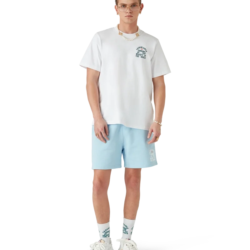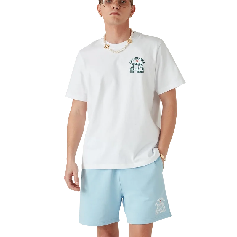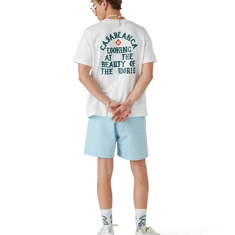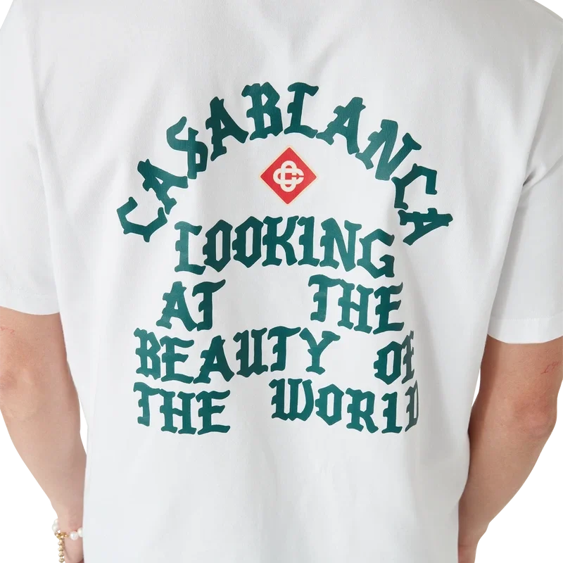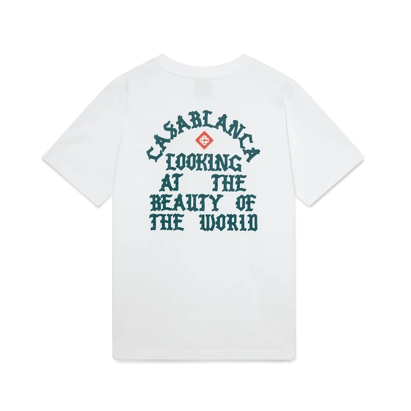 Le t-shirt « The Beauty of the World » est un modèle à manches courtes imprimé, confectionné en coton biologique et arborant la devise de la marque Casablanca dans une typographie gothique inspirée de la culture urbaine. Il est doté d’un col rond classique et du logo en forme de losange emblématique de la maison.