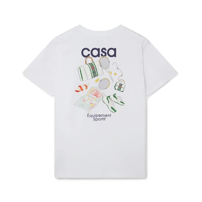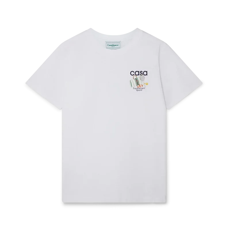 Le t-shirt Equipement Sportif présente un imprimé reprenant l’œuvre emblématique de la maison, réinterprétée pour cette saison, sur la poitrine gauche et repris en plus grand au dos. Confectionné en 100 % coton biologique, il est doté d’un col rond classique et d’une étiquette griffée Casablanca.