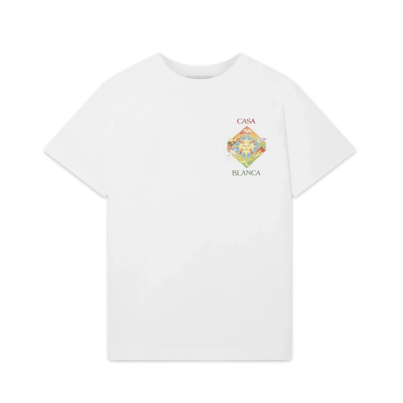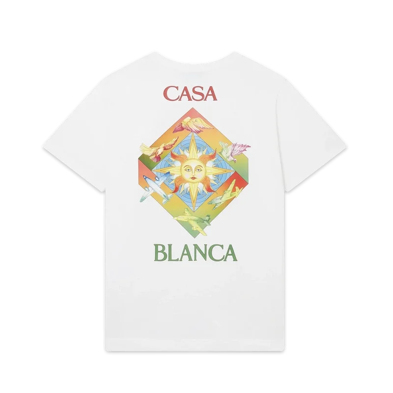 Le t-shirt en coton biologique sérigraphié Les Elements présente un motif saisonnier intégrant la symbolique de Casablanca et l’iconographie arabe, avec des colombes de la paix. Modèle classique à col rond, manches courtes et étiquette de la marque Casablanca Paris, conçu pour une coupe décontractée.