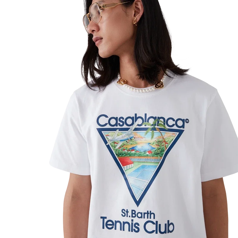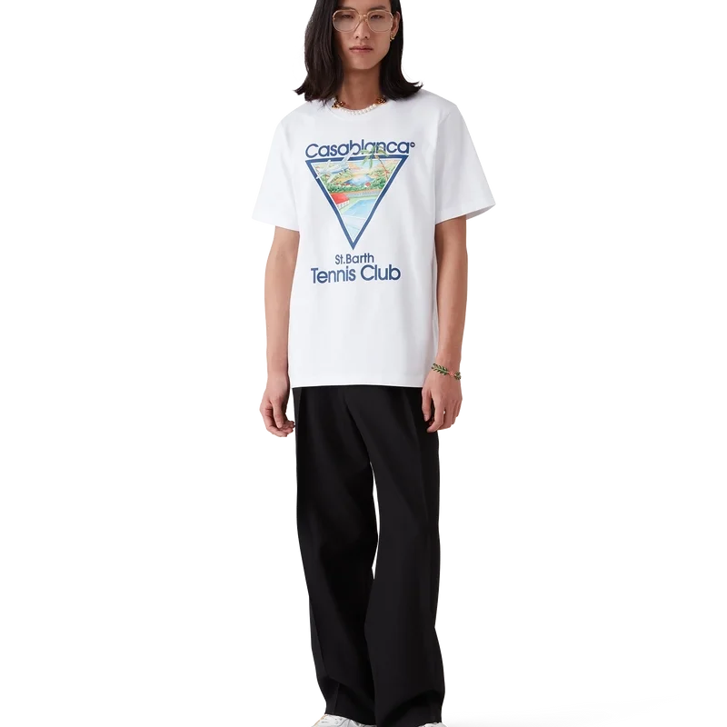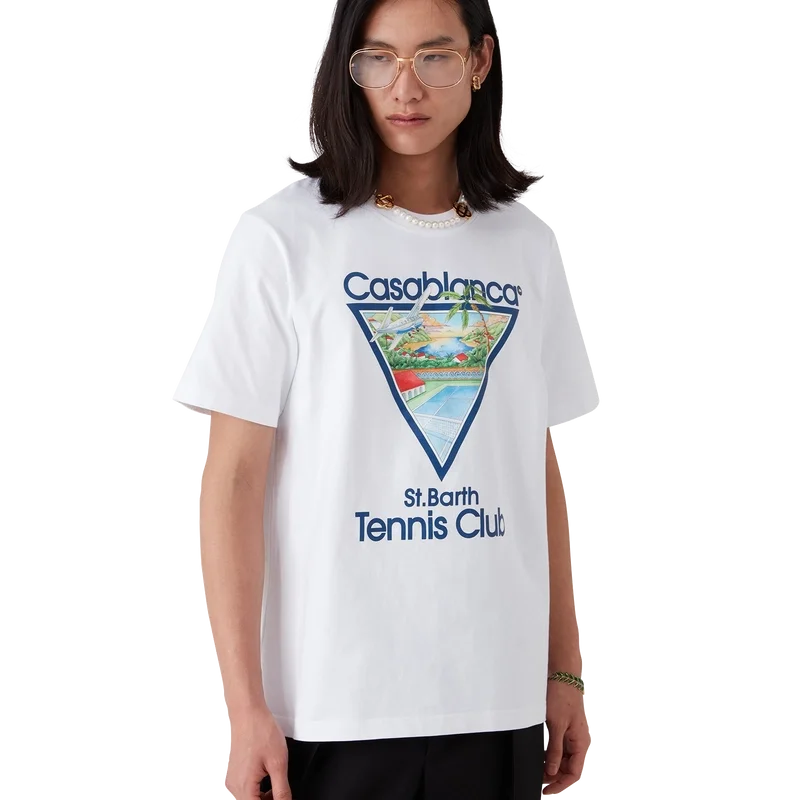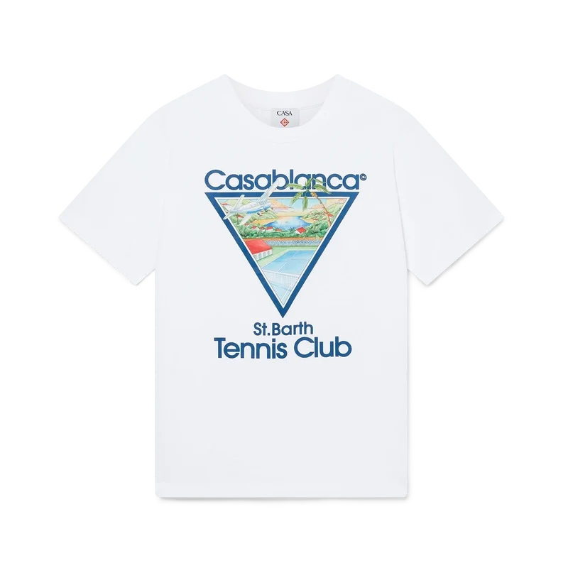 Le t-shirt Tennis Club Icon est un modèle à manches courtes imprimé, confectionné en coton biologique. Il présente une version saisonnière de notre illustration emblématique Tennis Club Icon, avec des éléments de design inspirés de la nature, de l’architecture et du tennis. Il est doté d’un col rond classique.