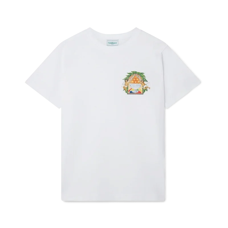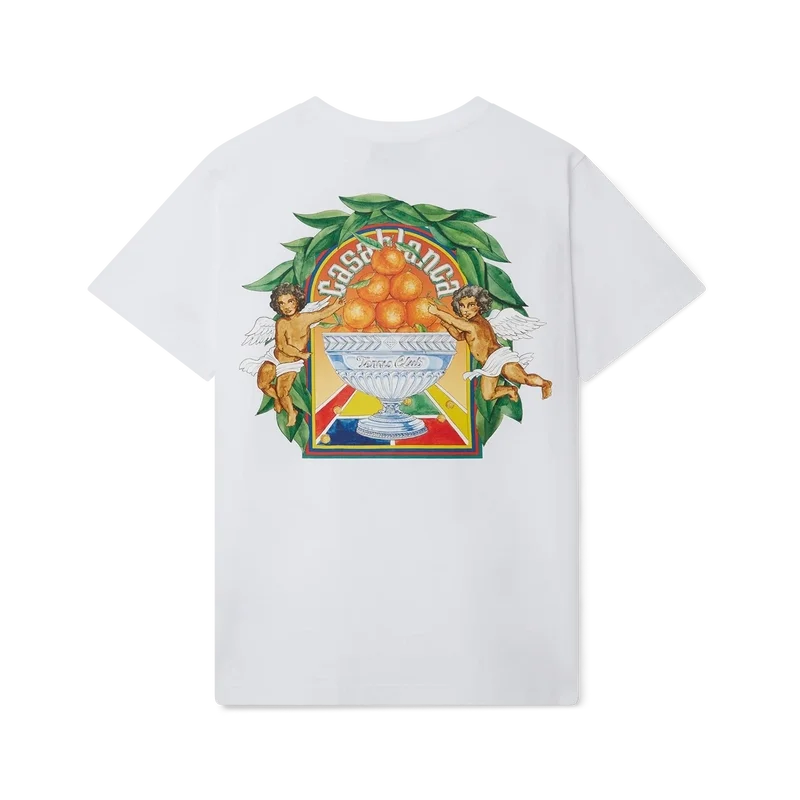 Le T-shirt Triomphe D’orange présente un imprimé représentant l’œuvre d’art emblématique de la maison, mêlant tennis et notre pyramide orange, répétée en plus grand au dos. Confectionné en 100 % coton biologique, il est doté d’un col rond classique et d’une étiquette griffée Casablanca.