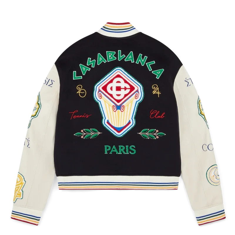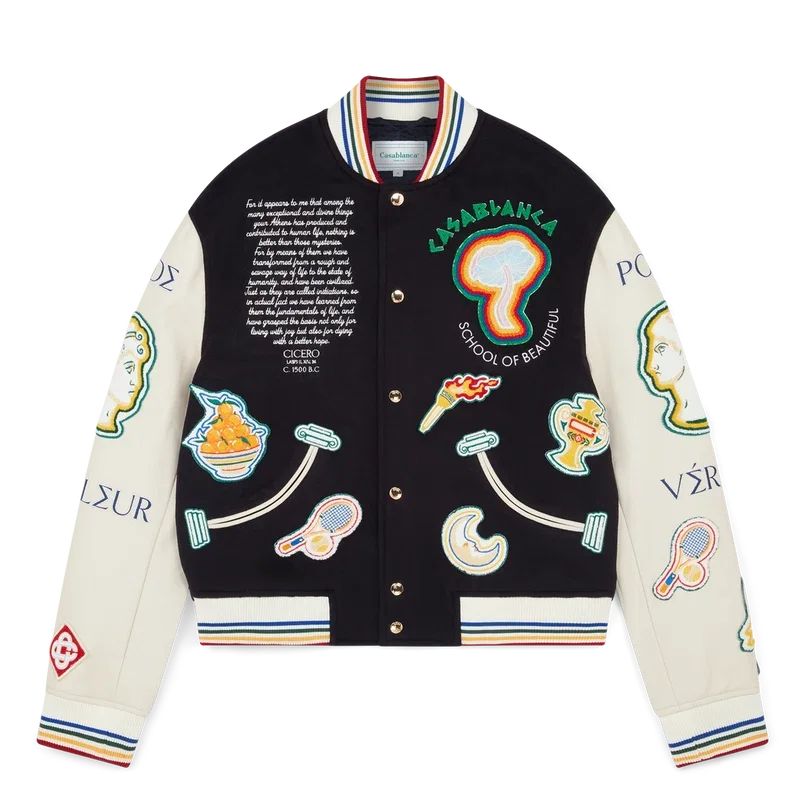 Le blouson aviateur en patchwork de chenille est un blouson de style aviateur traditionnel reprenant des motifs iconographiques utilisés dans les collections précédentes. Confectionné en laine vierge et en cuir, il est orné de broderies de lettres grecques inspirées de la Grèce antique, entremêlées d’éléments futuristes et des motifs emblématiques de la maison, tels que la feuille de laurier, une raquette et une balle de tennis, des oranges et une torche. Elle est agrémentée de motifs saisonniers inspirés de la Grèce antique, d’ouvertures de poches en forme de colonnes ioniques incurvées, d’une fermeture à boutons avec des finitions plaquées or griffées, d’un col montant côtelé, ainsi que de poignets et d’un ourlet ornés de rayures multicolores.