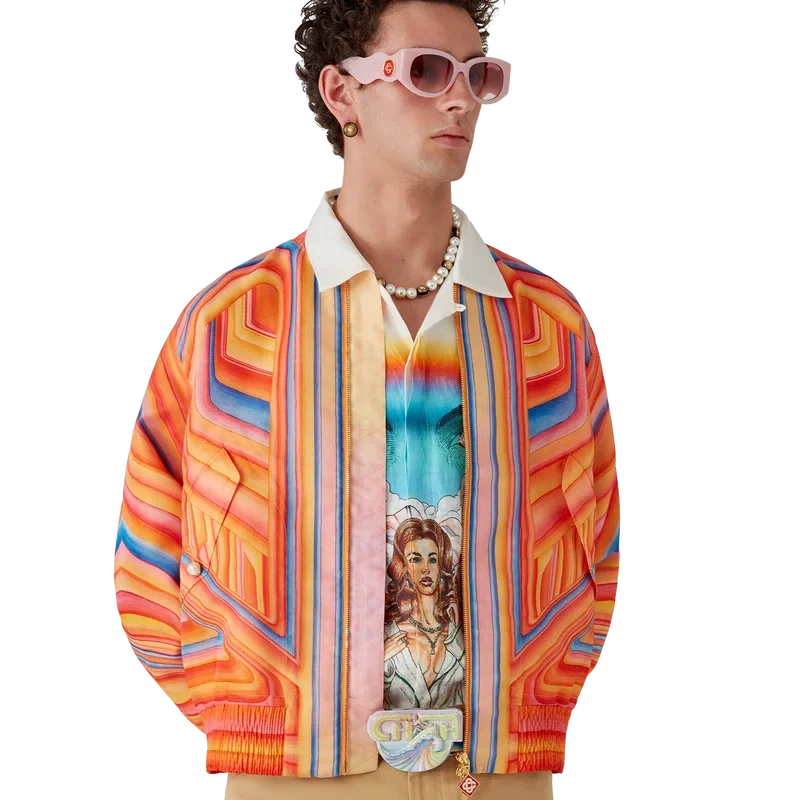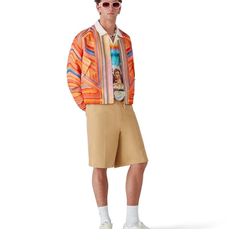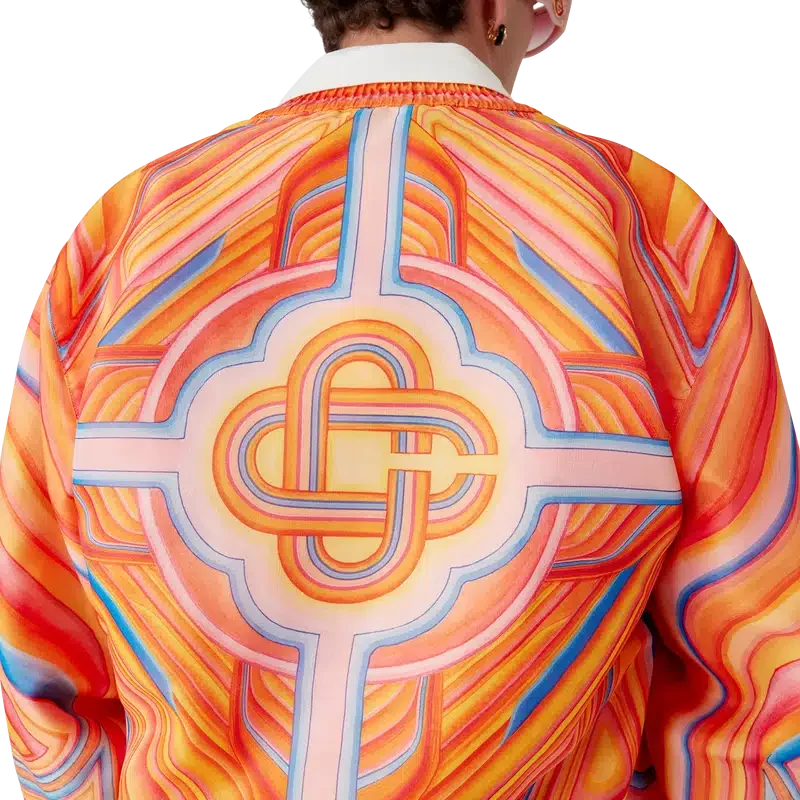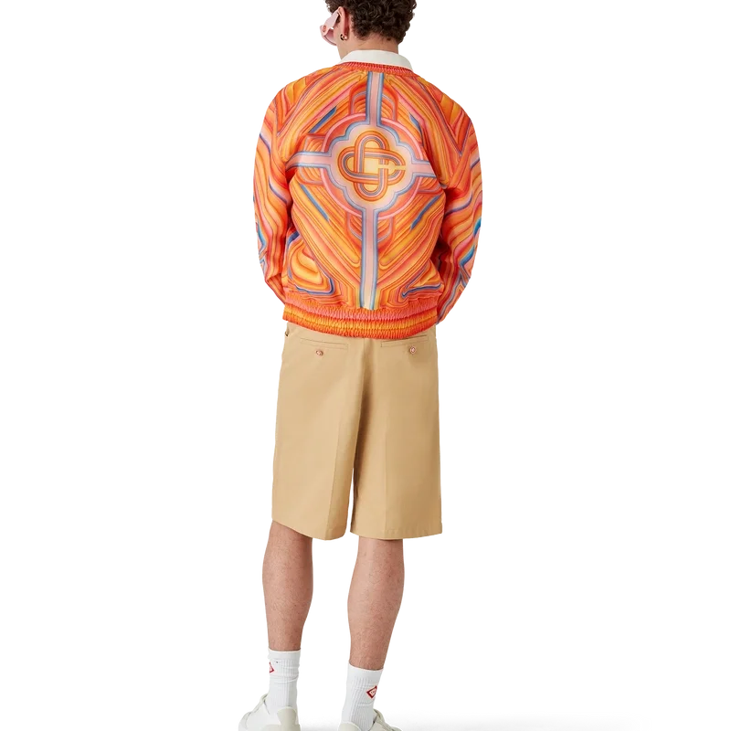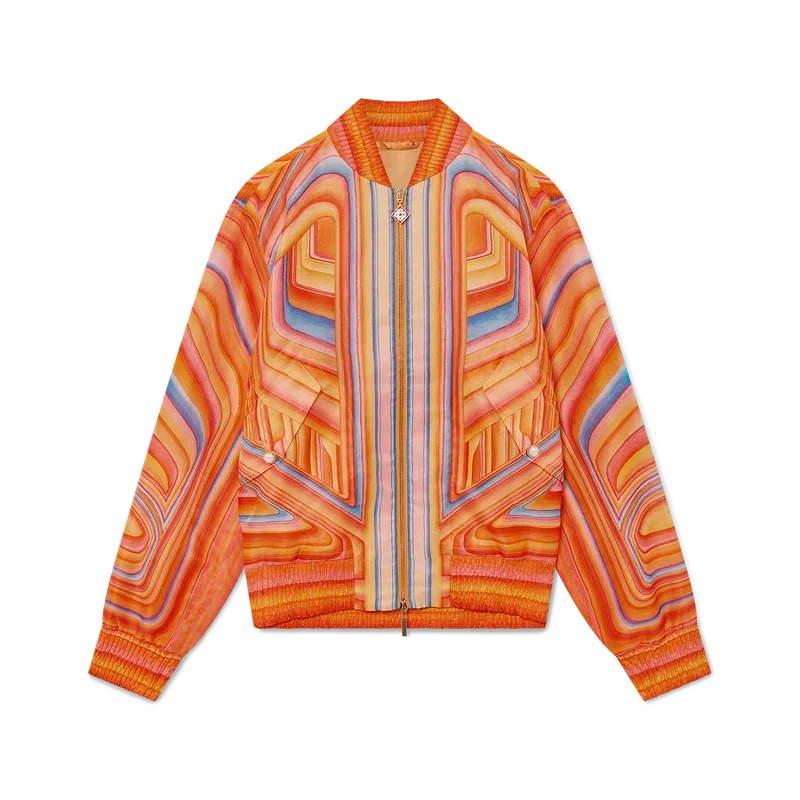 Le blouson aviateur Low Rider en organza présente un motif imprimé et une silhouette classique. Il est confectionné dans un tissu technique et arbore le motif Low Rider de la saison. Il est doté d’une fermeture à glissière ornée du logo en losange emblématique de la maison sur la tirette, de poches à rabat sur le devant fermées par des boutons en perle à bordure dorée emblématiques, ainsi que d’un col montant, de poignets et d’un ourlet en bord-côtes.