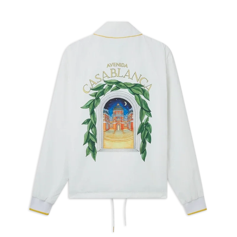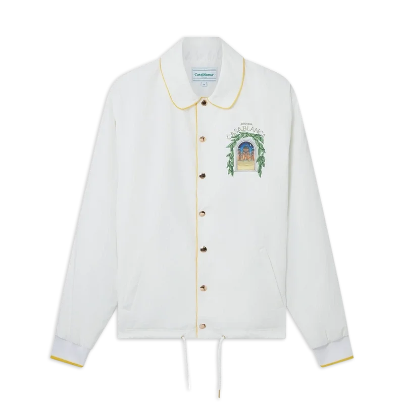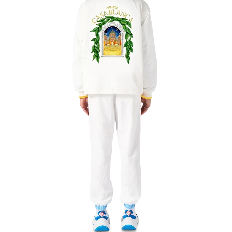 La veste Coach Casablanca Avenida en blanc présente un imprimé phare de la saison où la fluidité de la nature rencontre la structure du design artificiel : l’arche, symbole abstrait de force. Finitions : bord-côte jaune, cordons de serrage et fermeture à boutons.