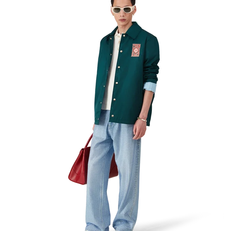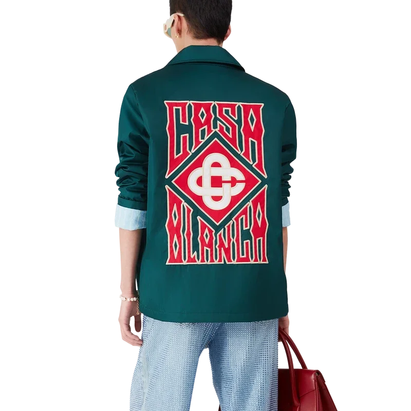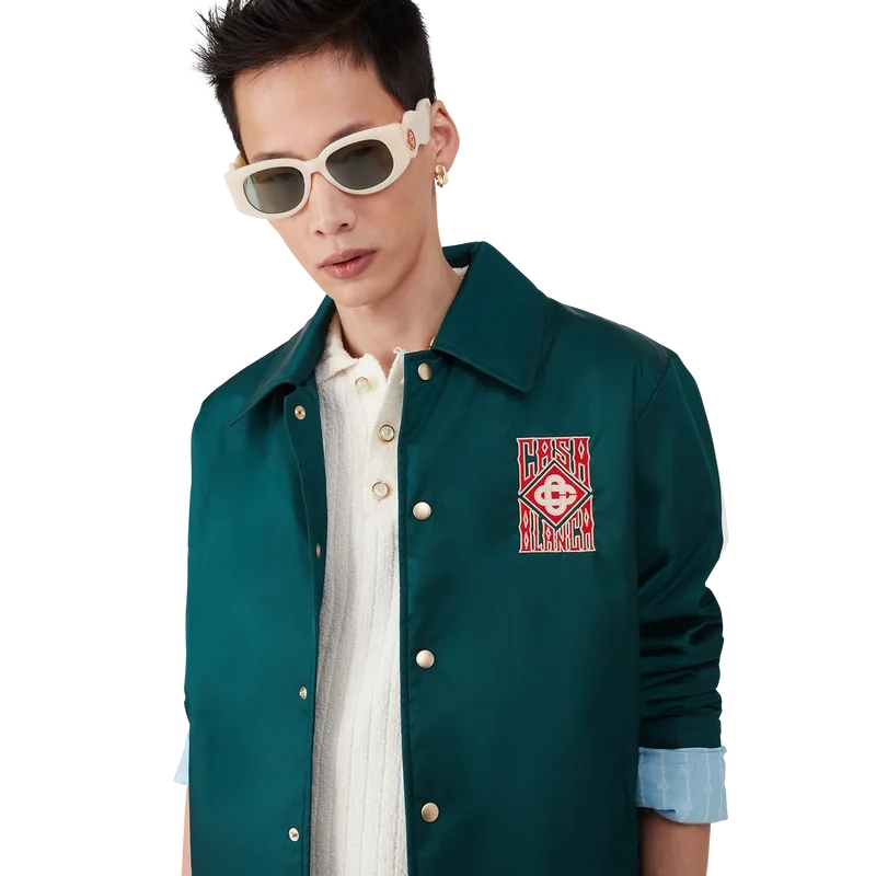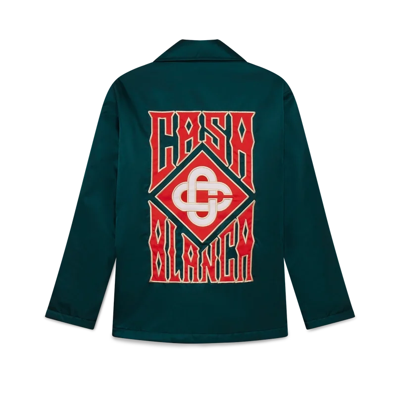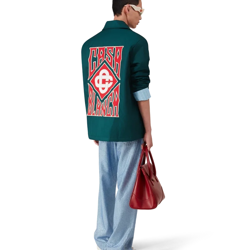 La veste de stade au logo gothique est un modèle léger à manches longues, confectionné dans un tissu technique et orné du logo gothique superposé de la maison. Elle est dotée d’une fermeture à boutons-pression plaqués or, d’un col en pointe, d’une doublure et de poches avant en biais.