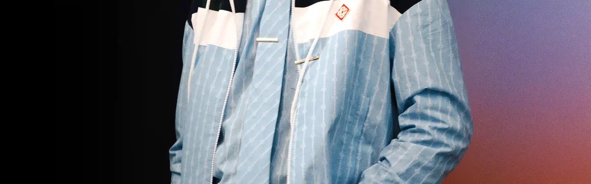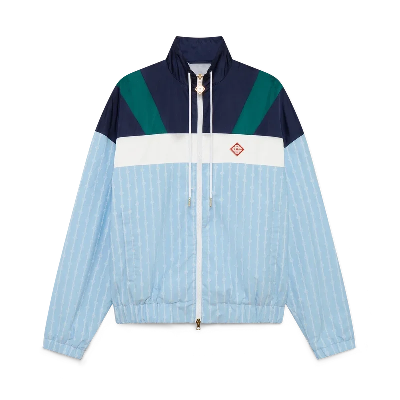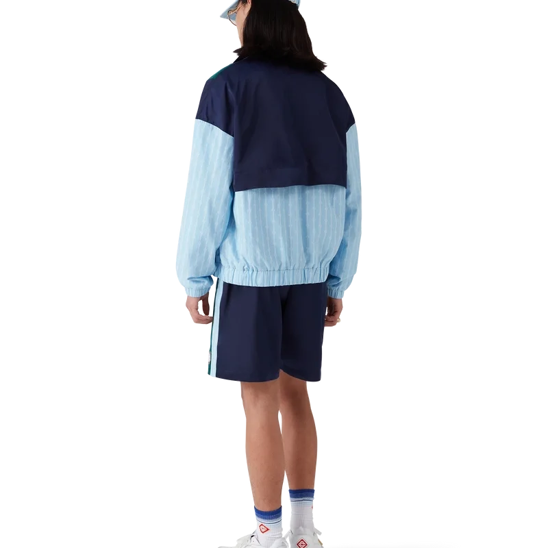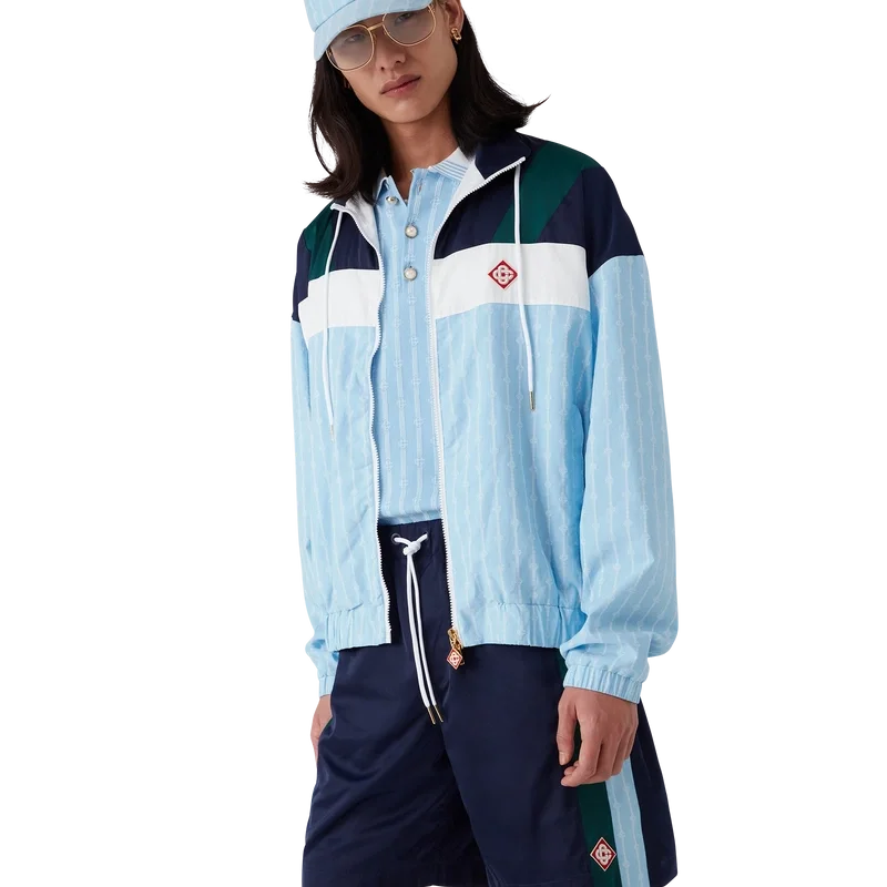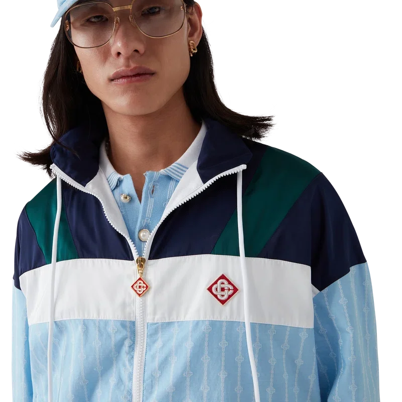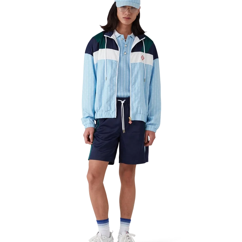 La veste de survêtement en nylon à fines rayures est un modèle de sport confectionné dans un tissu technique et orné du logo en losange emblématique de la maison. Elle est dotée d’une fermeture à glissière, de empiècements bleu marine, verts et blancs sur les épaules et la poitrine, d’un col polo avec cordon de serrage, de poches passepoilées verticales, d’une protection anti-pluie et d’un empiècement d’aération, ainsi que d’un ourlet et de poignets élastiqués.