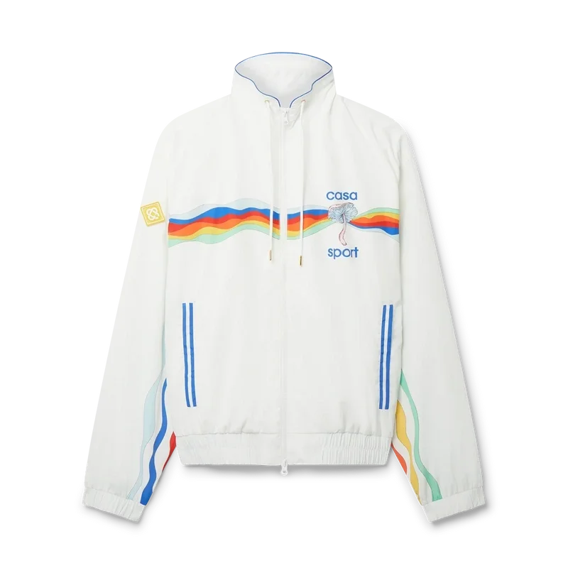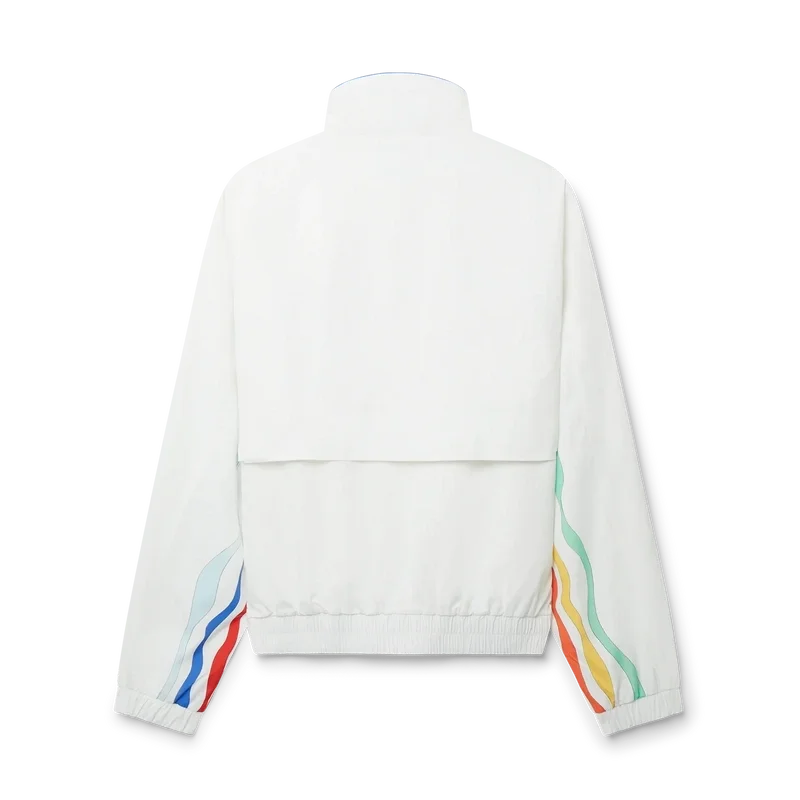 Le luxe sportif revisité dans un style rétro avec notre veste de survêtement Mind Vibrations Wave Shell en polyester blanc. Ce vêtement d’extérieur athlétique intègre notre motif Mind Vibrations, thème phare du printemps/été 2023, dans une silhouette classique de veste de survêtement, avec fermeture éclair sur le devant, poches latérales et cordons de serrage aux extrémités dorées. Elle est ici associée à un short de survêtement assorti.