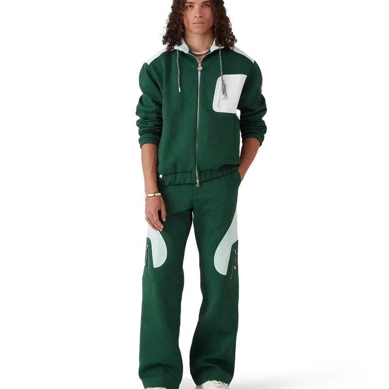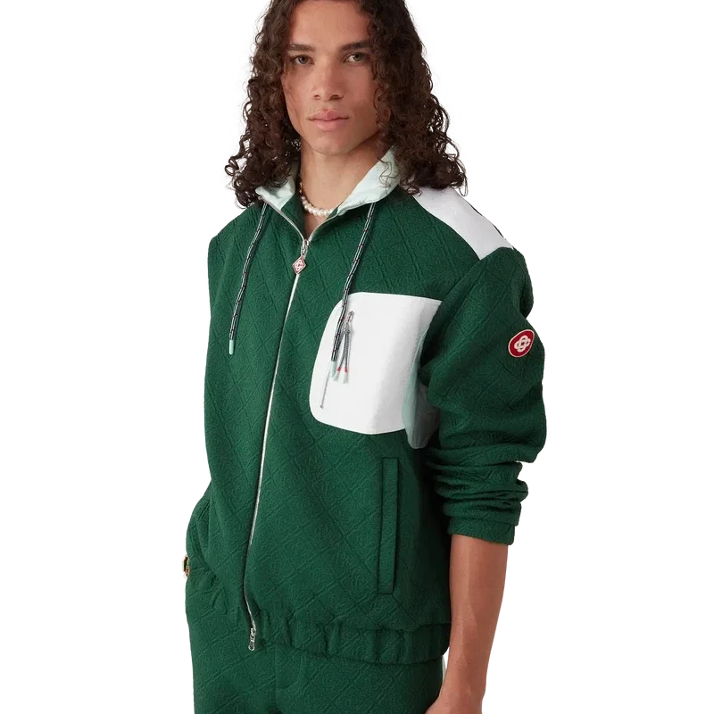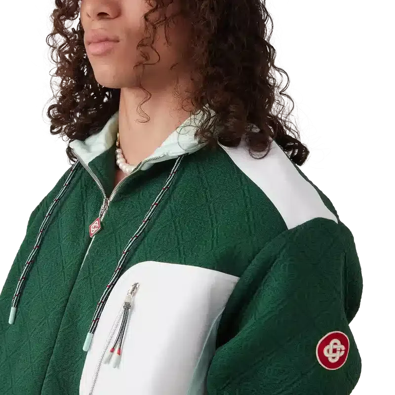 La veste en jacquard Monogram en nylon est un modèle à manches longues confectionné dans un tissu en maille jacquard. Elle est dotée d’un col montant avec cordon de serrage, d’une fermeture à glissière, de poches passepoilées verticales et d’une poche poitrine contrastée avec fermeture à glissière, de poignets et d’un ourlet élastiqués, de renforts aux coudes, d’un patch avec le logo CC de la Maison sur la manche, d’un empiècement sous les aisselles avec trou d’aération et d’une doublure en maille.